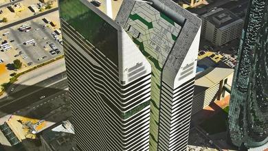 Deluxe Class Modern Bed and Breakfast. (exterior) Tall modern high rise building with a green glass facade. (lobby) The property has a modern reception...