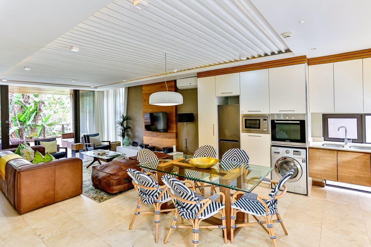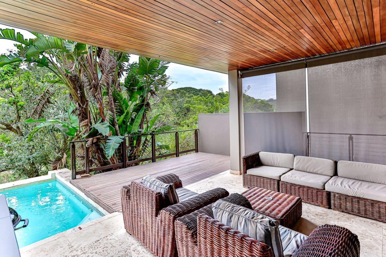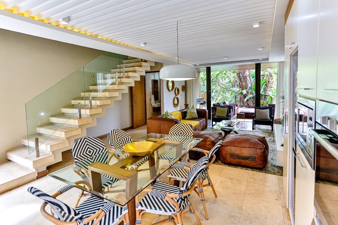 Welcome to this exquisite luxury holiday home nestled within the prestigious Zimbali Estate. Designed with impeccable attention to detail and high-end finishes throughout, this 3-bedroom retreat offers the ultimate in comfort and style. All bedrooms are situated on the top level, ensuring privacy and tranquility. The heart of the home is the open-plan kitchen, complete with a central dining table, flowing seamlessly into a spacious lounge featuring a leather couch and stylish occasional chairs – perfect for relaxing after a day of exploring. Step outside to a beautifully extended d