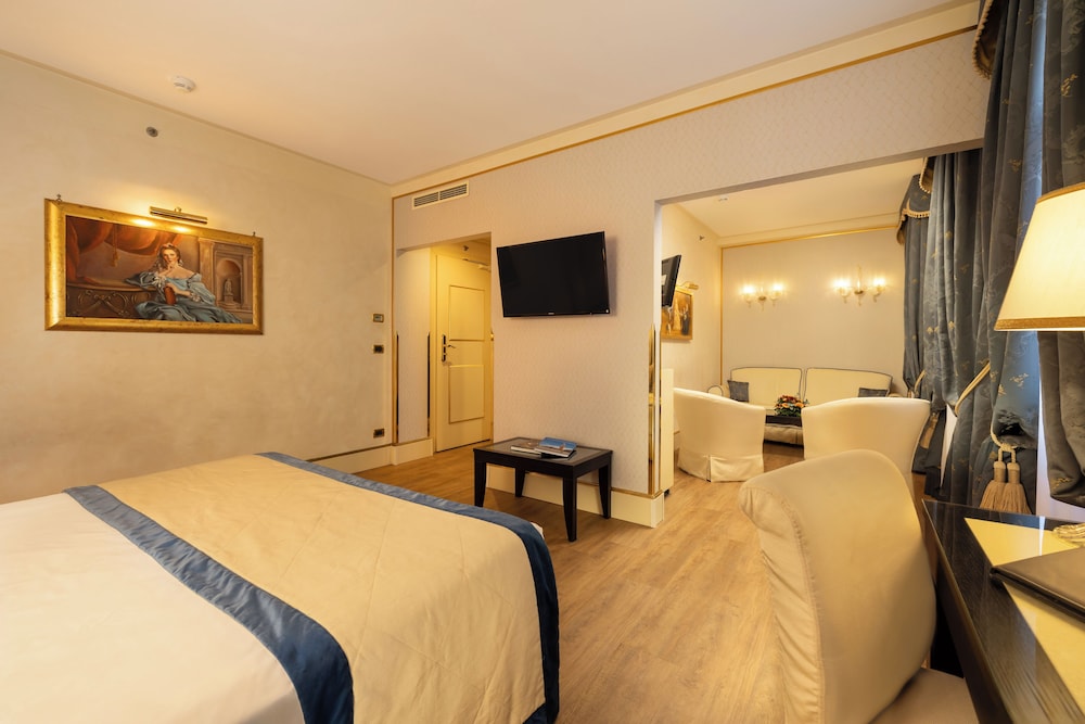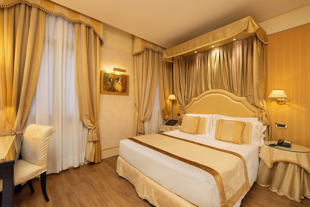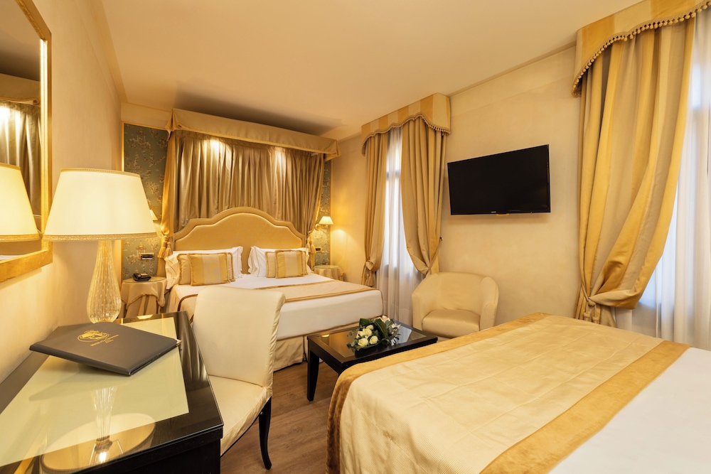 The hotel is located in one of the most lively, interesting areas of ancient Venice, right to the Grand Canal and opposite the Goldoni theatre. It is just 200 m away from the famous St. Mark's Square and conveniently situated close to the shopping boutiques of Venice. The railway station is 2 km away and it is about 4 km to Venice lagoon. The elegant property was built in 1880 and was renovated in 2006. This air-conditioned city hotel comprises a total of 5 floors with 35 rooms. Amongst the facilities count a foyer with a 24-hour reception desk, a safe and a currency exchange facility. Further amenities include a café, a bar and a restaurant. Room and laundry services are also available. The guest rooms are fitted with luxurious furnishing and fully-equipped as standard including an LCD TV, wireless Internet access and a minibar.