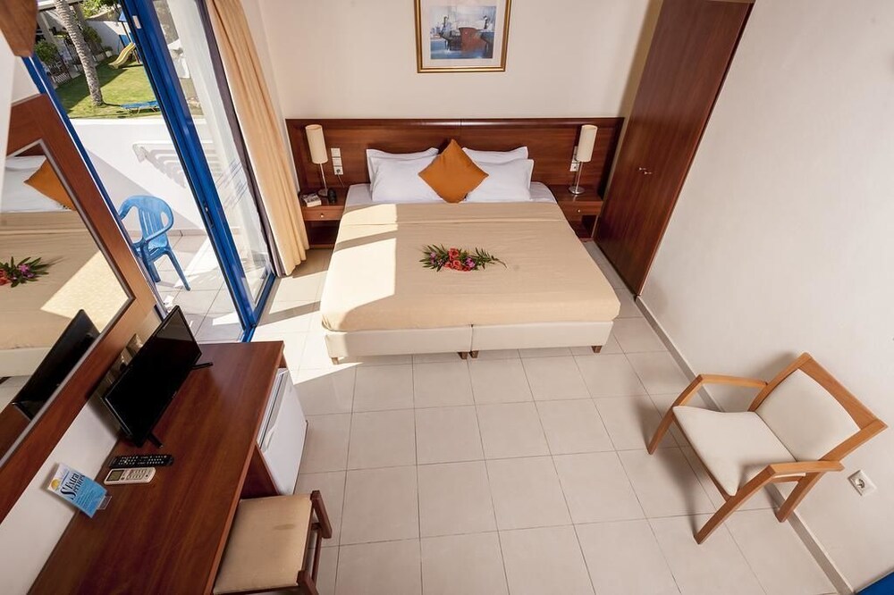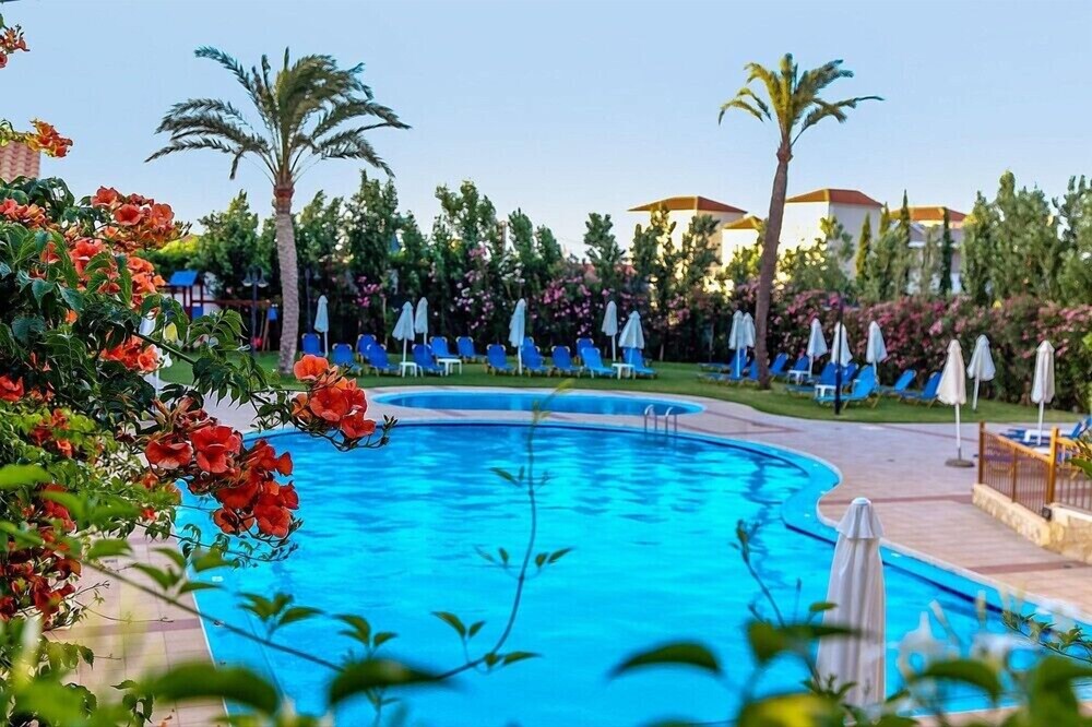 The hotel has two swimming pools, children's pool, pool bar, garden, playground, reception with limited opening hours, sitting lounge with TV, Internet access (extra charge), restaurant and snack bar.The rooms are furnished and equipped with TV, telephone, radio, bathroom, hair dryer, mini-bar, Internet connection (extra charge), air condition (extra charge), safety box (extra charge) and balcony or veranda.**Note: Reception with limited opening hours. Please advise flight number and estimated arrival time when booking this hotel.**In case of choosing the option of "all inclusive":The All Inclusive-concept includes all meals (breakfast, lunch, dinner and snacks) and mealtime drinks such as soft drinks, beer, wine, water and alcoholic drinks, all of local brands. Drinks are served from morning until late evening (approx until 22.-24.00 hrs). Opening times vary between different hotels. In certain hotels the activities program is also included.Address: 73006 Tavronitis, Chania, Crete, Greece.
