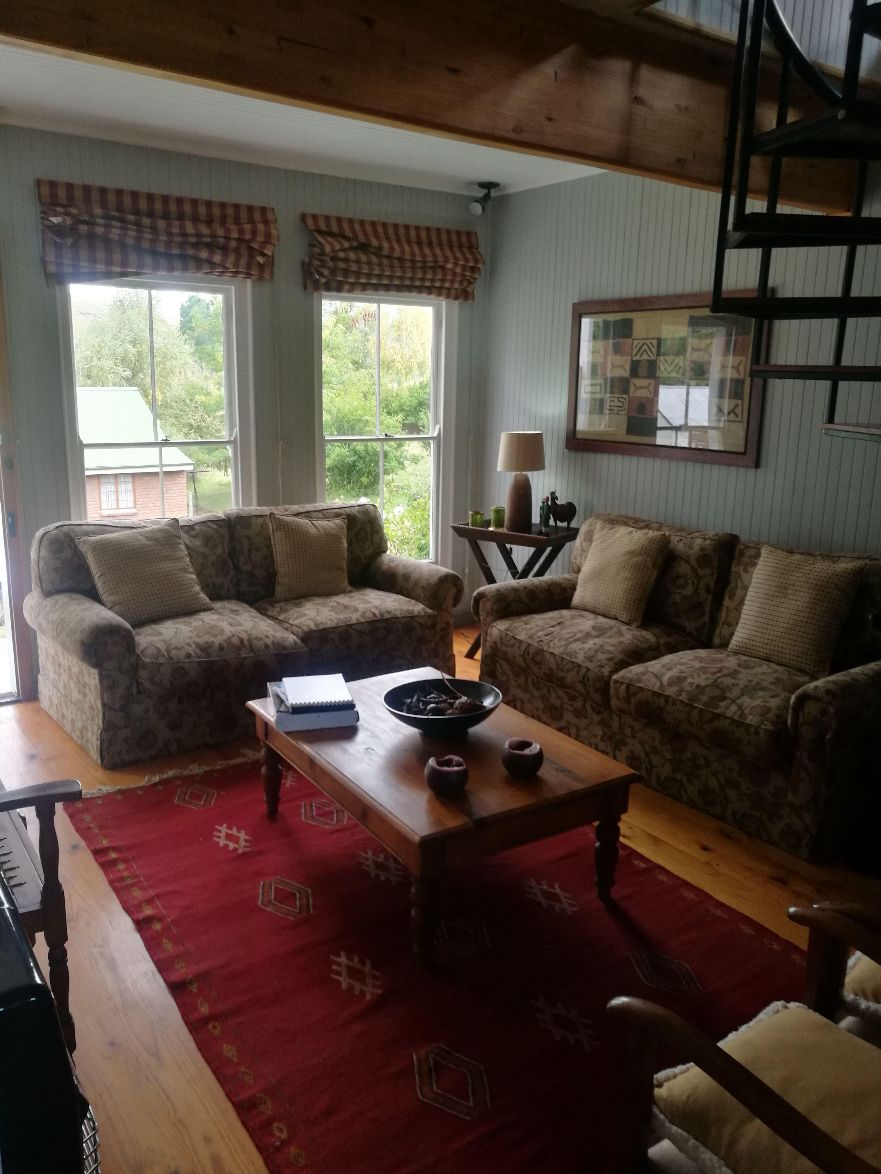 Ash Cottage is a cosy gem located in Rhodes, Eastern Cape. This small mountainous village is set along the Bell River, rich with wild trout.This cottage has two bedrooms in the downstairs area. The main bedroom has an en-suite bathroom and has a double bed. A spiral staircase leads to a loft area with twin beds. The second and loft bedrooms share a bathroom. There is an open-plan living area consisting of a kitchen, a lounge and a dining area. The kitchen is fully fitted featuring a gas stove, a gas fridge and all the necessary utensils. Linen and towels are provided. O