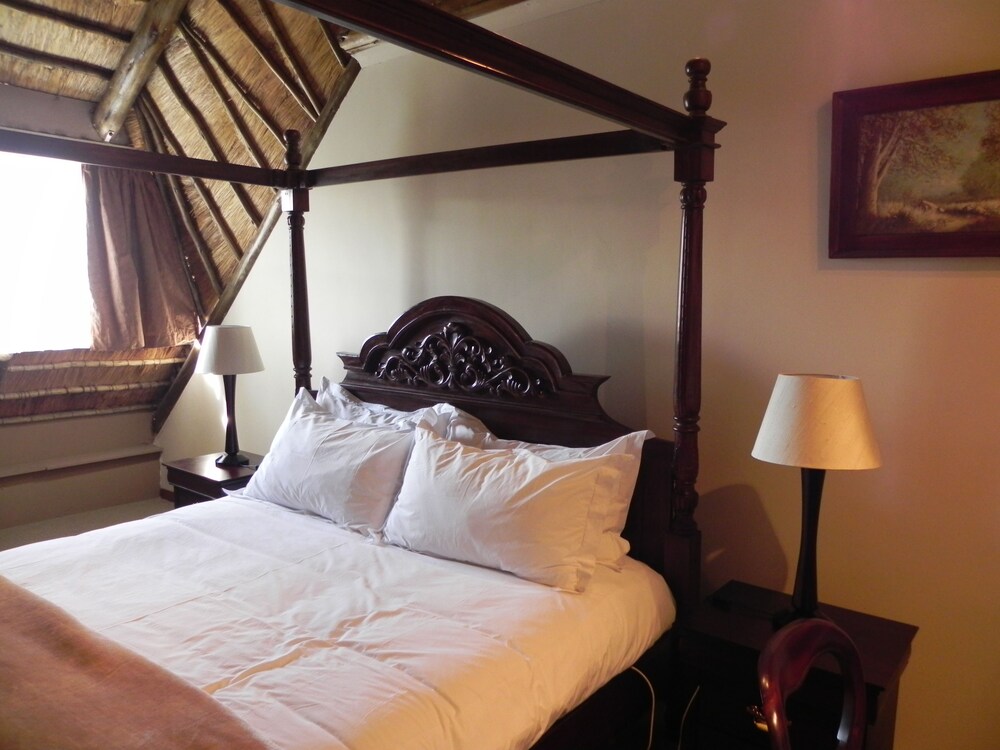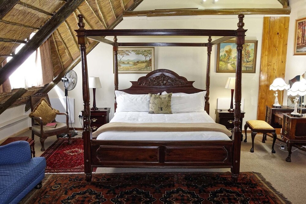 The upstairs rooms are located under a magnificent thatch roof, with views overlooking the valley or garden, while the downstairs rooms have classic pressed ceilings and full bathrooms.