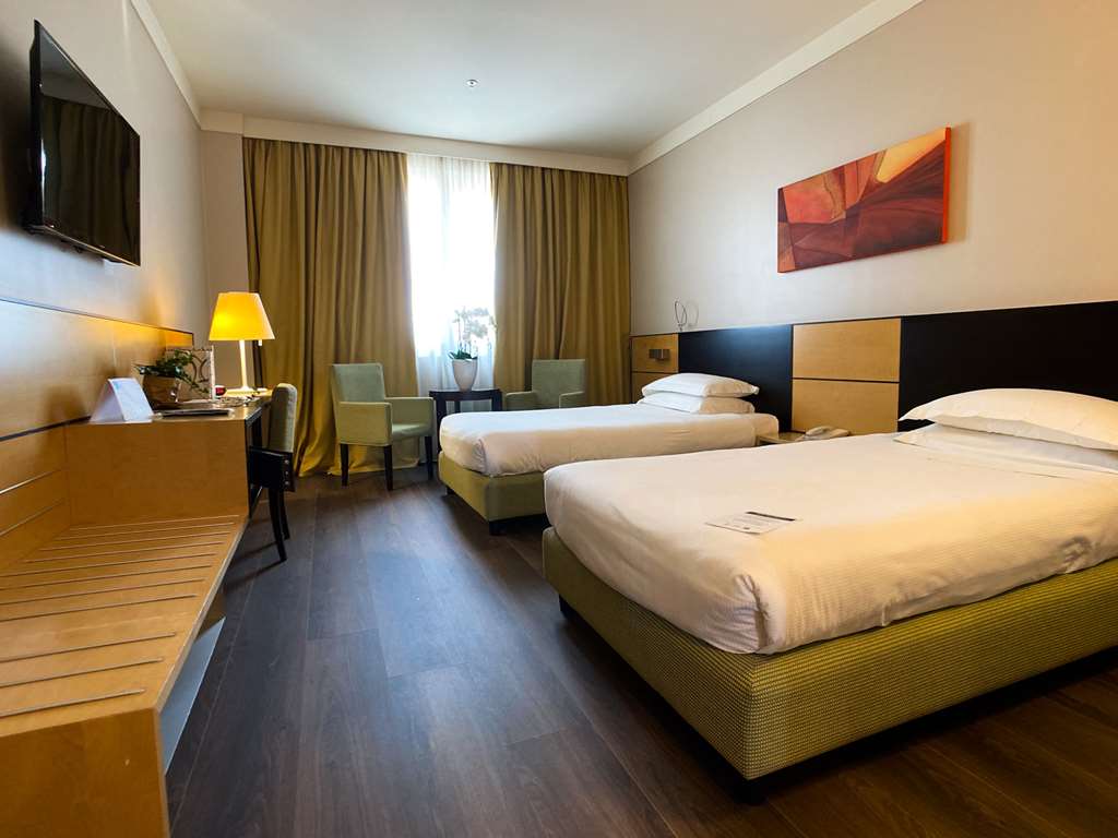 An indoor pool Wi-Fi private garden and complimentary breakfast are provided by the Best Western Plus Hotel Le Favaglie located about 20 minutes from Milan's city center. This four-story hotel has 112 rooms with elegant contemporary decor. flat-panel TVs Wi-Fi and work desks. Safes hairdryers and ironing facilities are included as well as coffeemakers and minibars. A complimentary breakfast is offered each morning. Guests can relax in the bar which overlooks the hotel's private garden. The hotel's restaurant Il Corniolo serves Italian specialties for lunch and dinner. A fitness center hot tub heated indoor pool and steam room are all available. The hotel provides a free shuttle to Molino Dorino Metro Station upon request. Guests can use the laundry services and business center and pets are permitted. The Best Western is located about a mile from the A4 and A50 Highways and five minutes from the Rho-Pero exhibition center and San Siro Stadium. Molino Dorino metro station is a 10-minute ride on