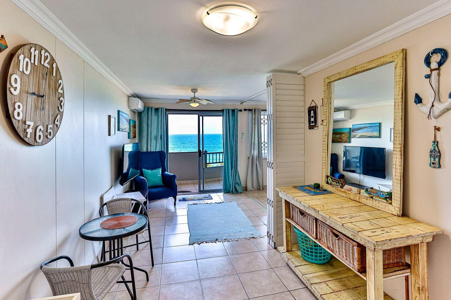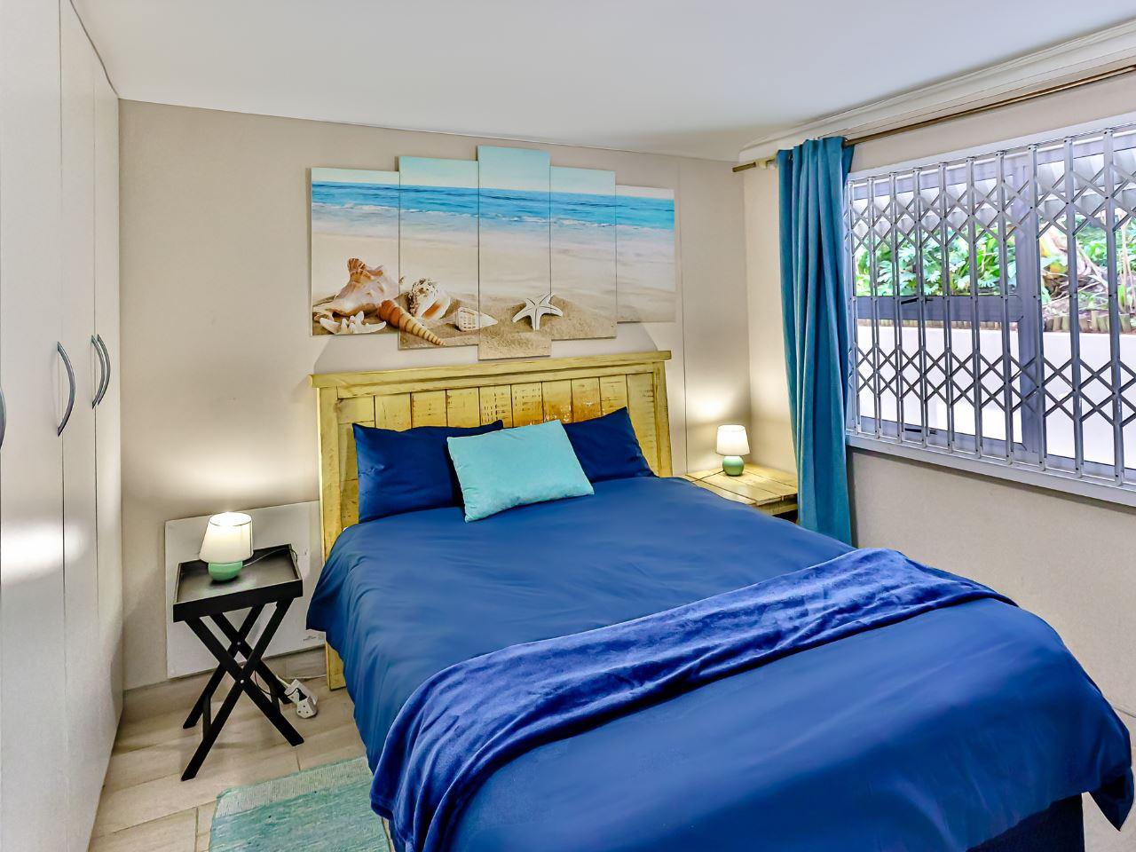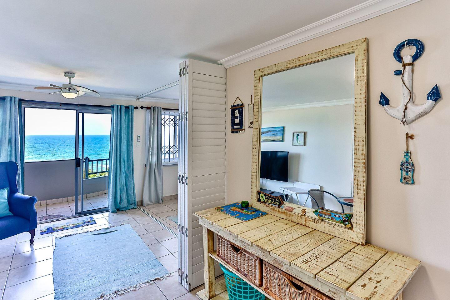One bedroom flat with double sleeper couch in the lounge with a partition to create privacy for the sleeper couch. . Just across the road from the beach and 10 kilometers south of Ballito. This lovely flat has aircon in lounge, queen bed and sleeper couch for two children (Under 12). Wifi available with Netflix. Air-fryer and safe available. Work desk in lounge.