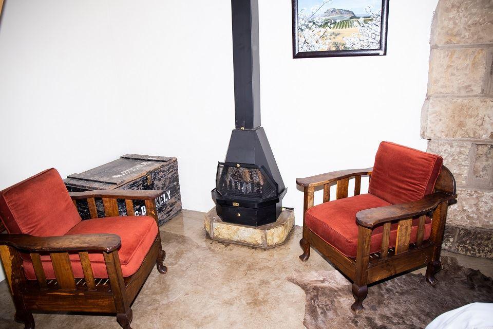 The lodge was built using local, hand-dressed sandstone. The wood for the ceiling and some of the furniture was sourced from alien invasive trees on our farm. The lodge is considered “off the grid” as the water runs directly from a mountain spring and solar power supplies the electricity for the fridge, lights and two plug points for charging cell phones. Unfortunately, the solar electricity system cannot support the surge of a microwave, hair dryer and other heat-based hair styling equipment (e.g. hair straighteners). Gas geysers heat the water in the bathrooms and kitchen. There are indoor and outdoor braai facilities.