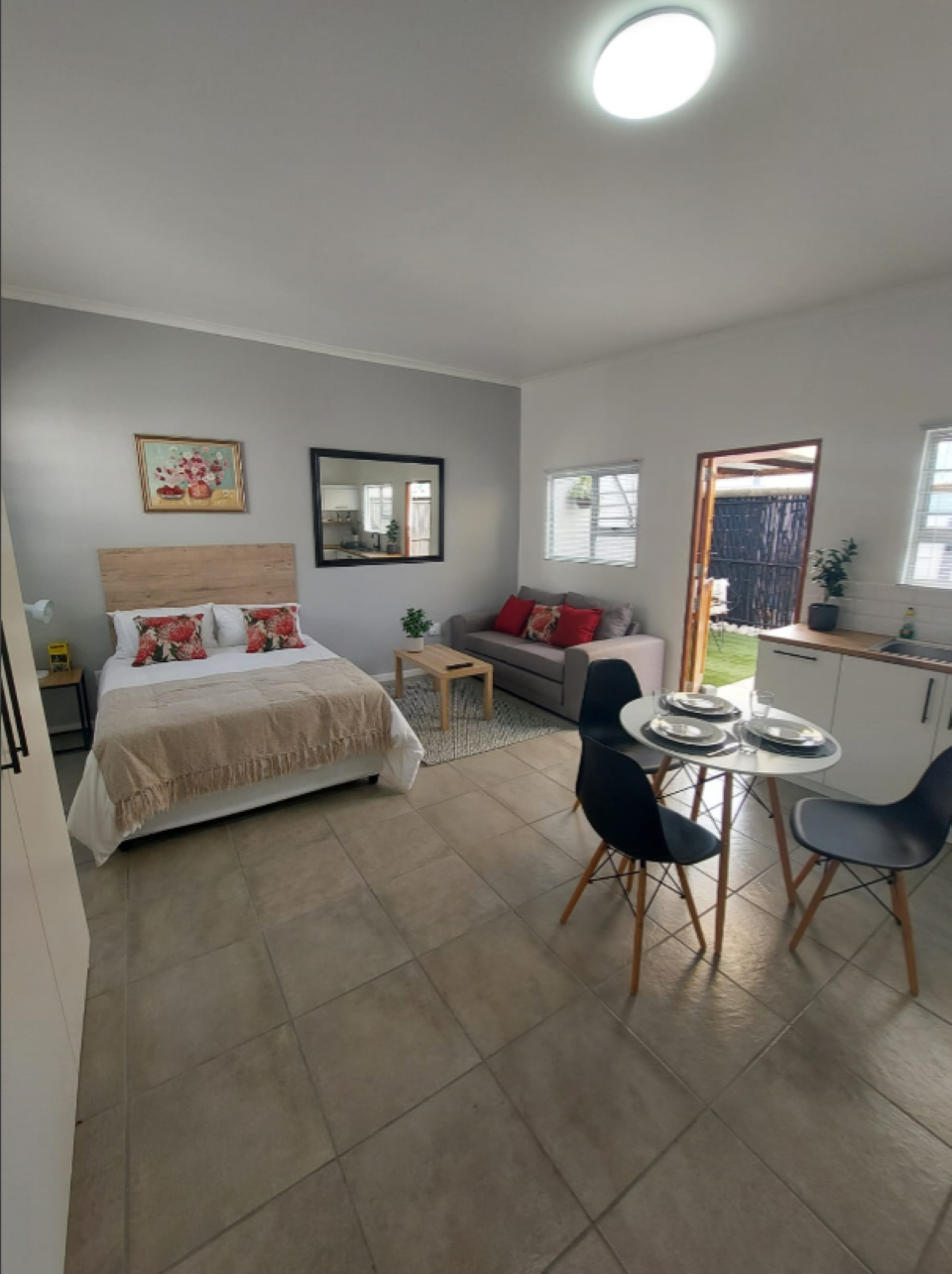 Boston Huisje is a bachelor, self-catering garden cottage, situated on the owner’s main property in Boston, Bellville in Cape Town, 21km from the CTICC. It has a kitchen, double bed with bed linen, towels, sleeper couch and an en-suite bathroom. It has a private entrance, TV with Netflix, free Wi-Fi, and tea- and coffee-making facilities. The unit opens onto a beautiful private courtyard with a table and chairs. This is a non-smoking unit and no parties are allowed on the property.It is the ideal place for guests looking for a centrally located getaway or business travellers.