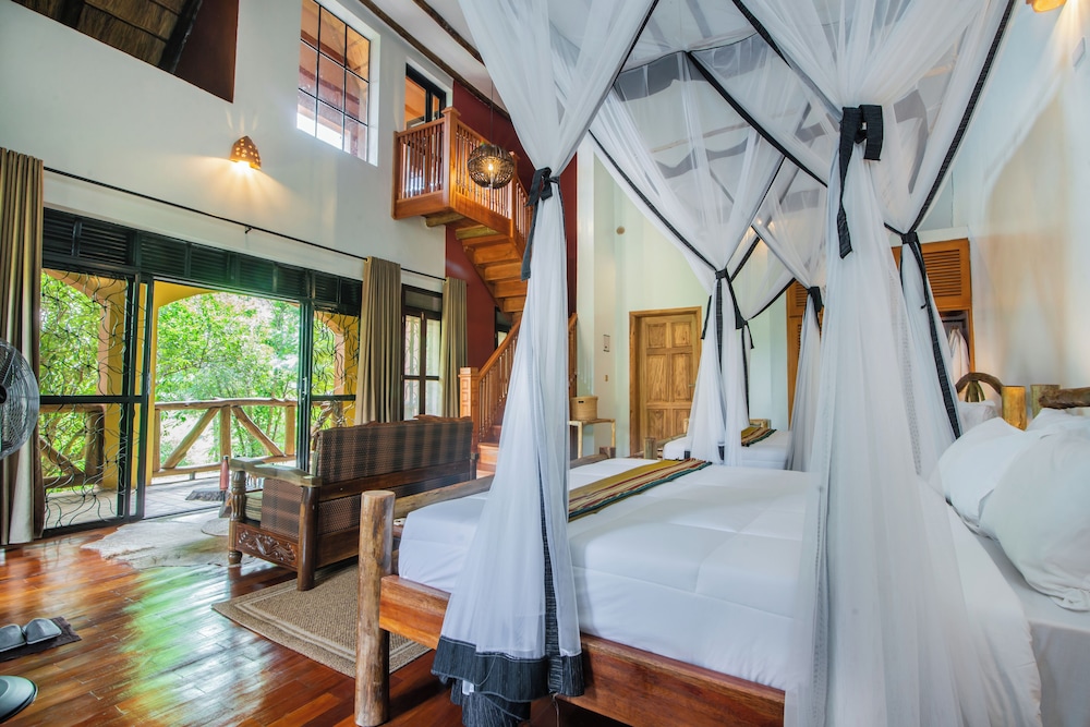 The lodge is a 14-room property, sitting on 25 acres of wilderness overlooking the popular Kazinga Channel Lake in Queen Elizabeth Park Uganda.