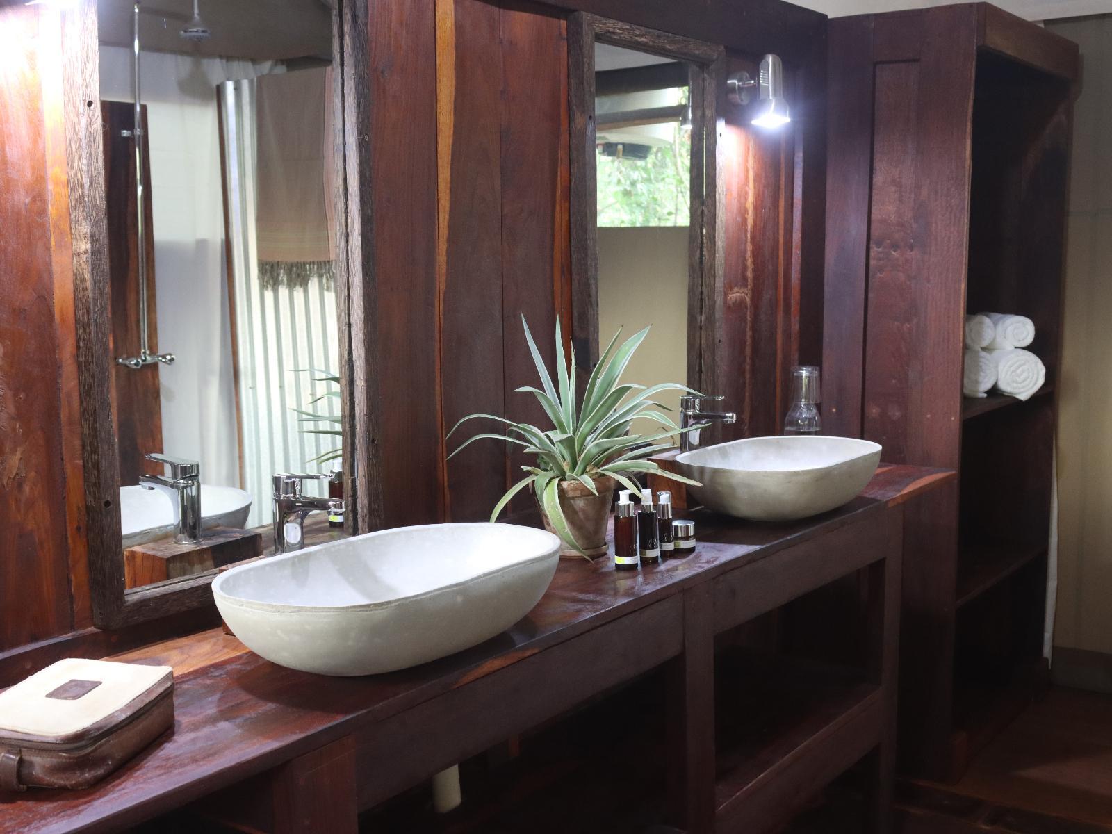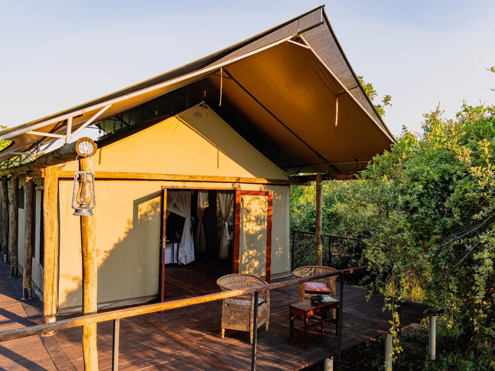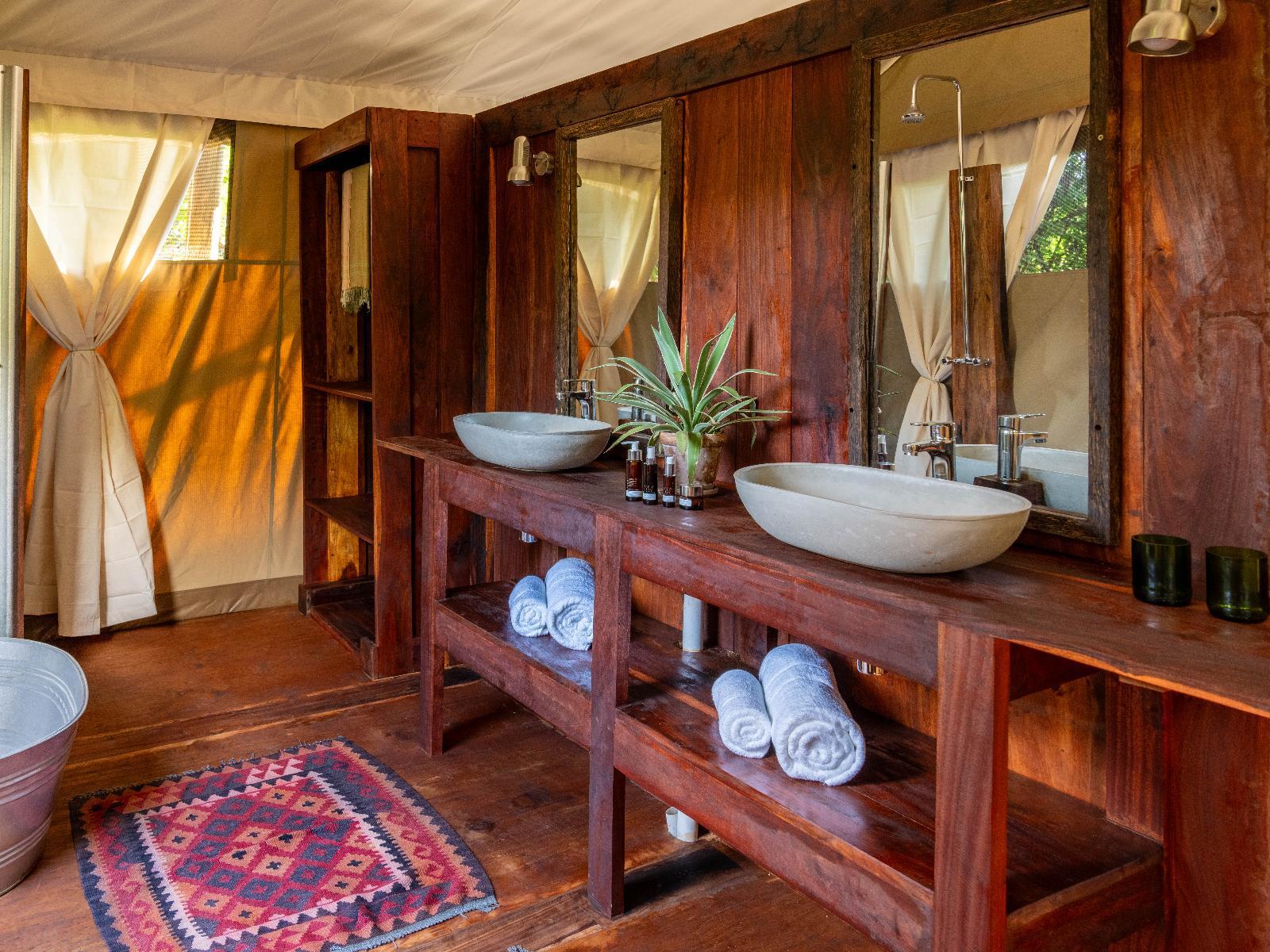 Each of our six luxury tented units accommodates 2 people and has an en-suite bathroom with an indoor shower, twin basins, a toilet, and access to a private outdoor shower. In addition, each tent is furnished with a king-size bed that can be converted to twin beds, sustainably sourced hardwood decor, a portable fan, and a spacious, private deck/terrace overlooking the flood plains out to the Luangwa River.