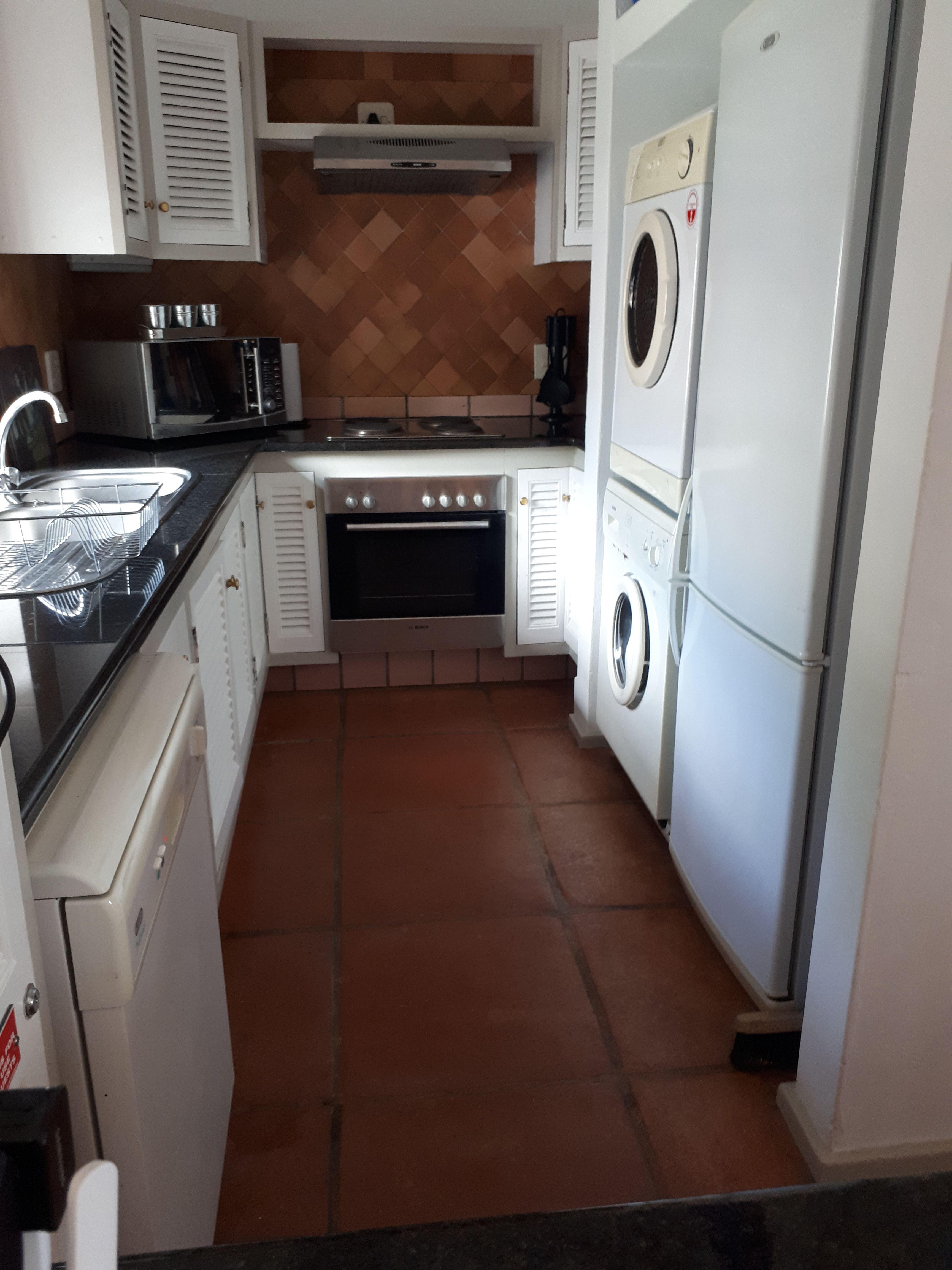 The kitchen has a fridge and freezer, extra two fridges, an oven, microwave oven, kettle, dishwasher, washing machine, tumble drier, cutlery and crockery. The living area is nice and spacious with a TV with a package of some of the DStv-channels. On the balcony, there is a Weber-braai and balcony set with a big table and chairs with cushions for six people to sit.