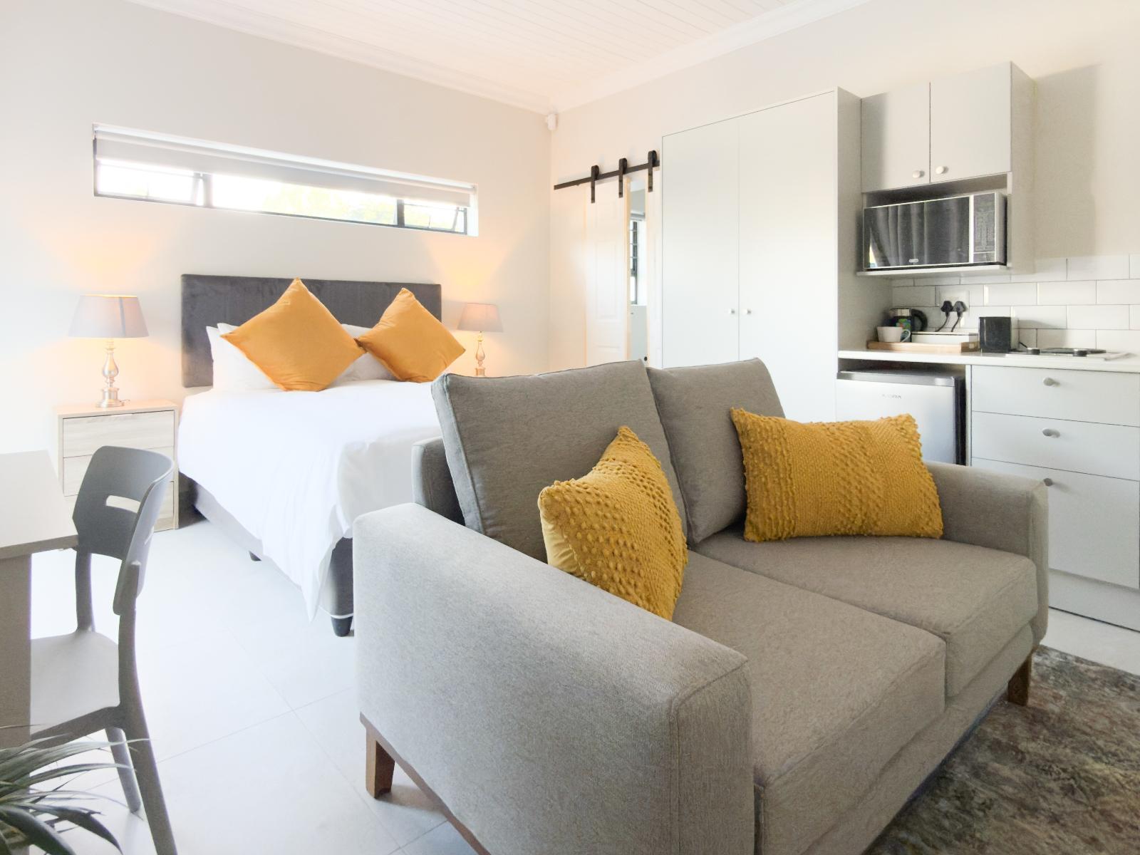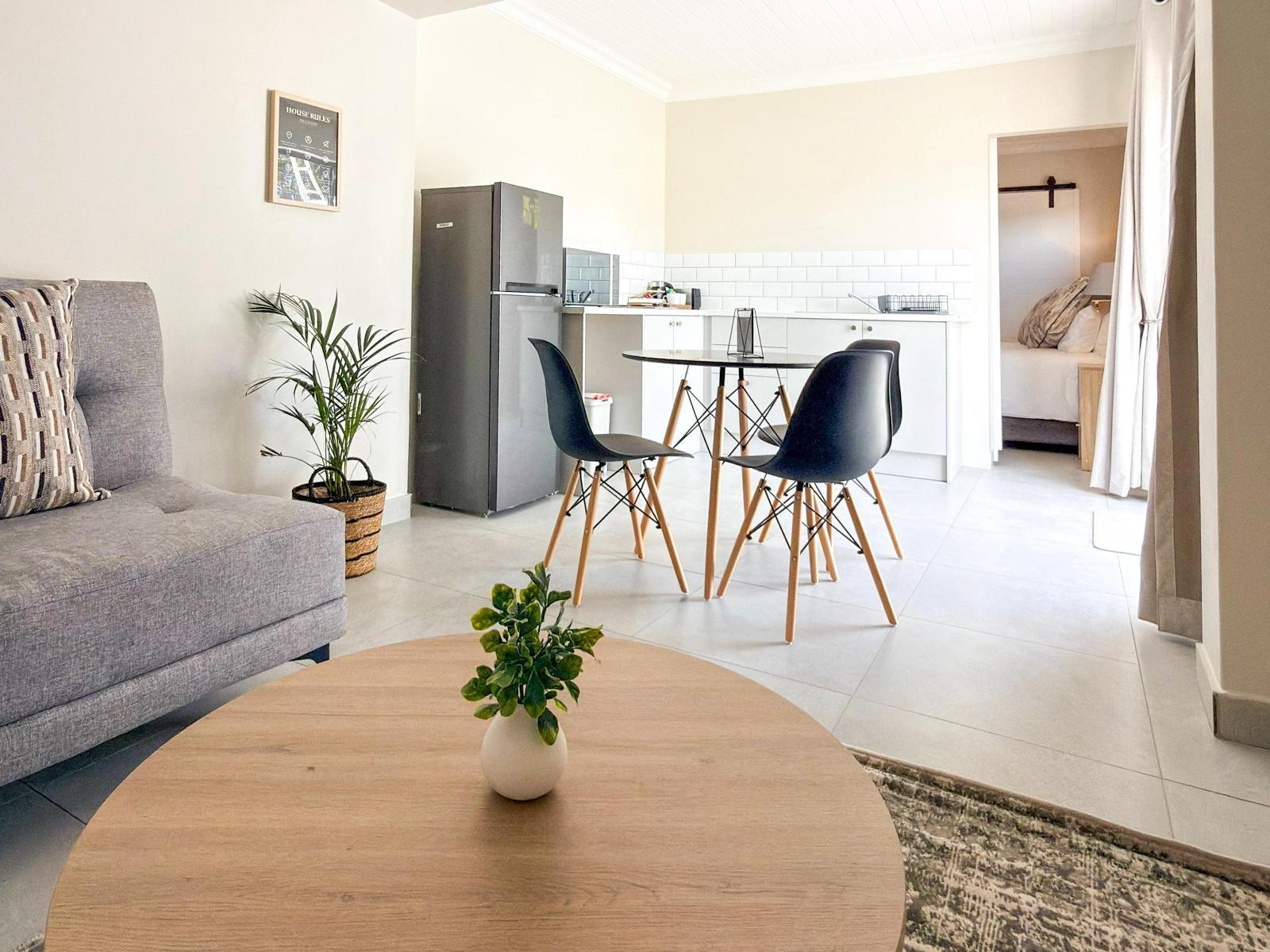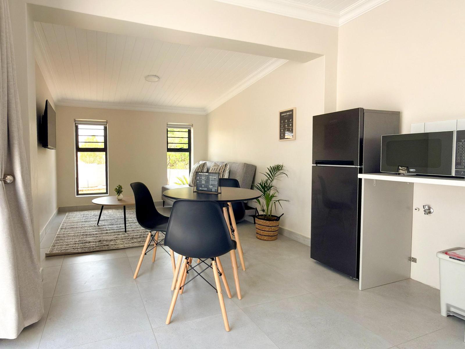 The guesthouse features contemporary self-catering units designed for ease and practicality. Each unit is tastefully furnished and includes a well-equipped kitchen which comes with a 2-plate stove, microwave, refrigerator, and tea-and-coffee making facilities. Guests can enjoy a dedicated workspace with a desk, a TV, and a comfortable seating and dining area. Select units offer garden views, and complimentary Wi-Fi is available throughout the property. Please note that for families and groups of 6 people, units 4 and 5 are interleading and can be booked together, subject to availability.