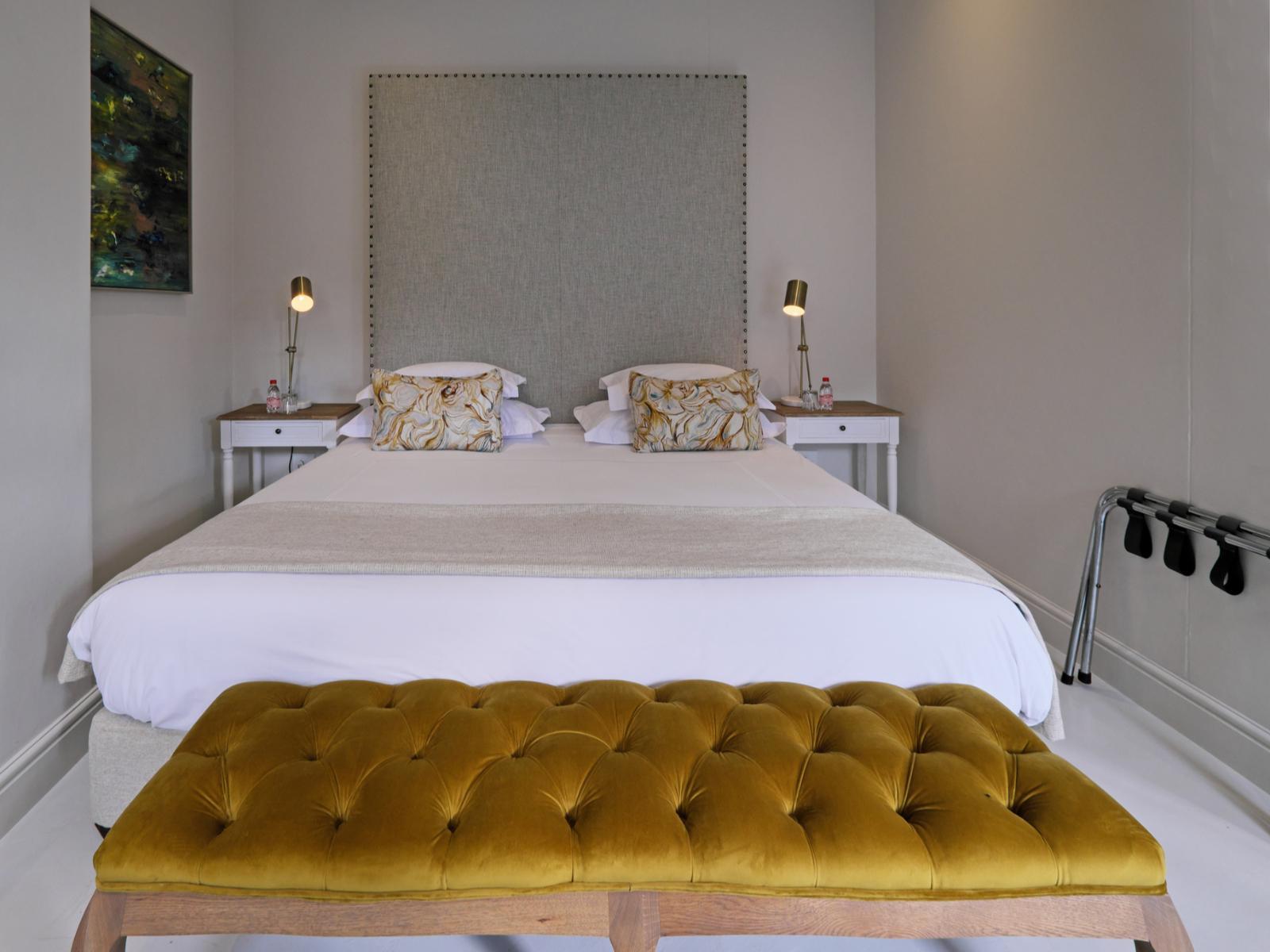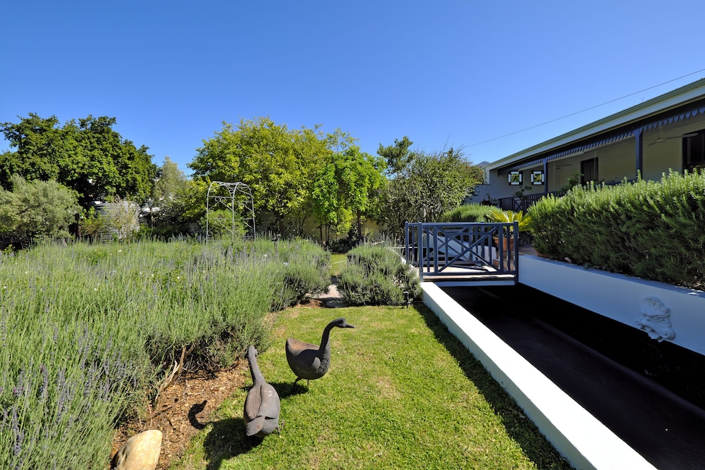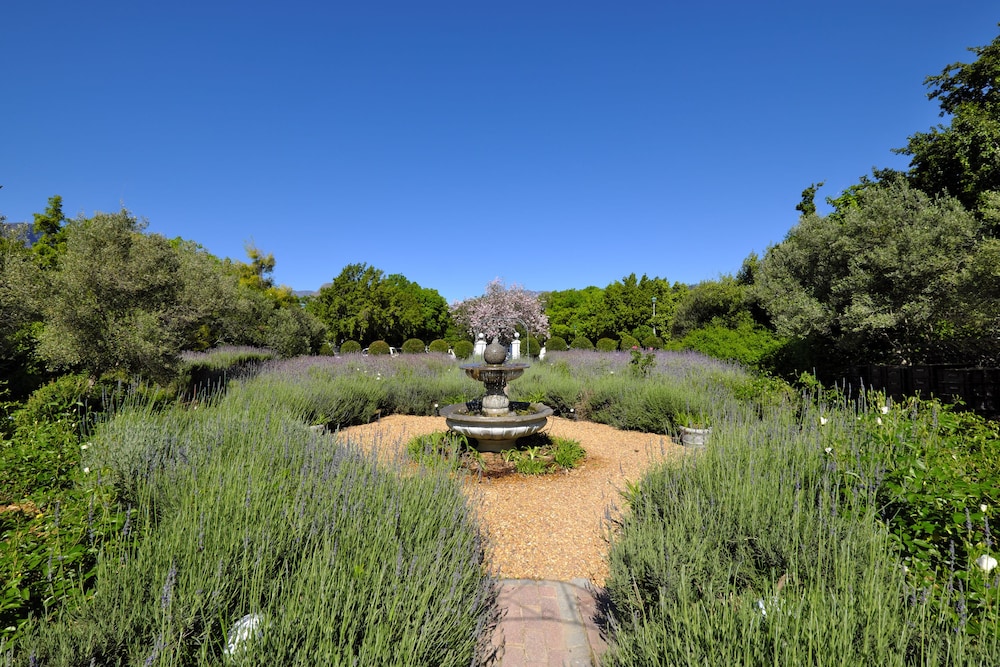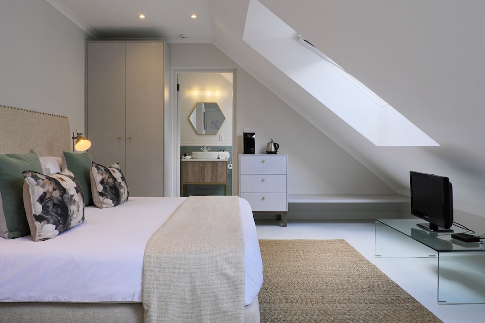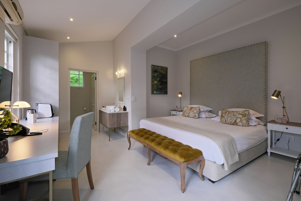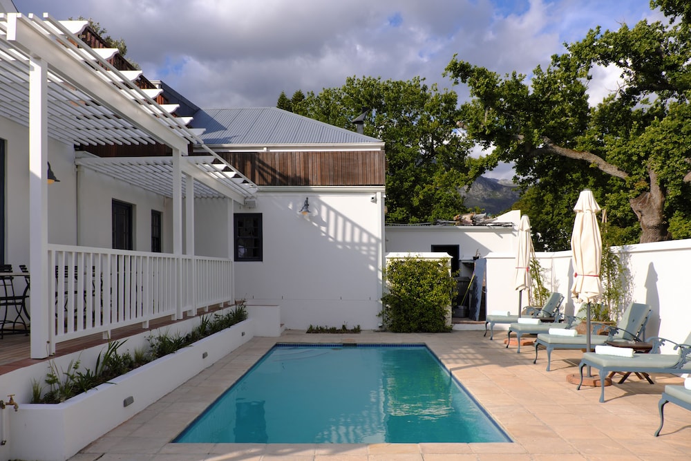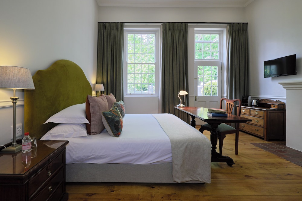 The recent renovations have captured many of the original features and restored them to their former glory. The décor is simply captivating, impressively combining heritage design with local creativity, charm, and color. The public areas of the hotel benefit from enormous attention to detail, including bespoke art pieces from local artists, and handpicked furniture and fabrics. The breath-taking lounge boasts exceptionally high ceilings and a strikingly generous original fireplace. The reception area leads into a bar and terrace overlooking the pool to one side, and the beautifully paneled breakfast room to the other side. The breakfast room unfolds on to the original veranda and on to a glorious garden of roses, lavender and beautiful indigenous trees creating an oasis of calm and relaxation against a backdrop of the Franschhoek mountains.