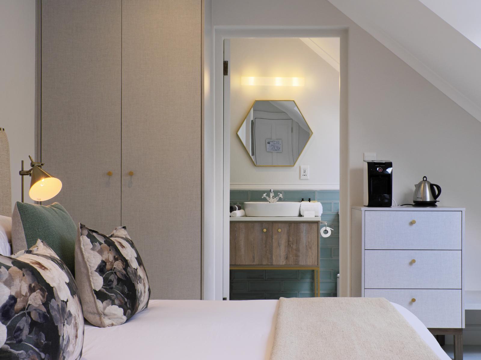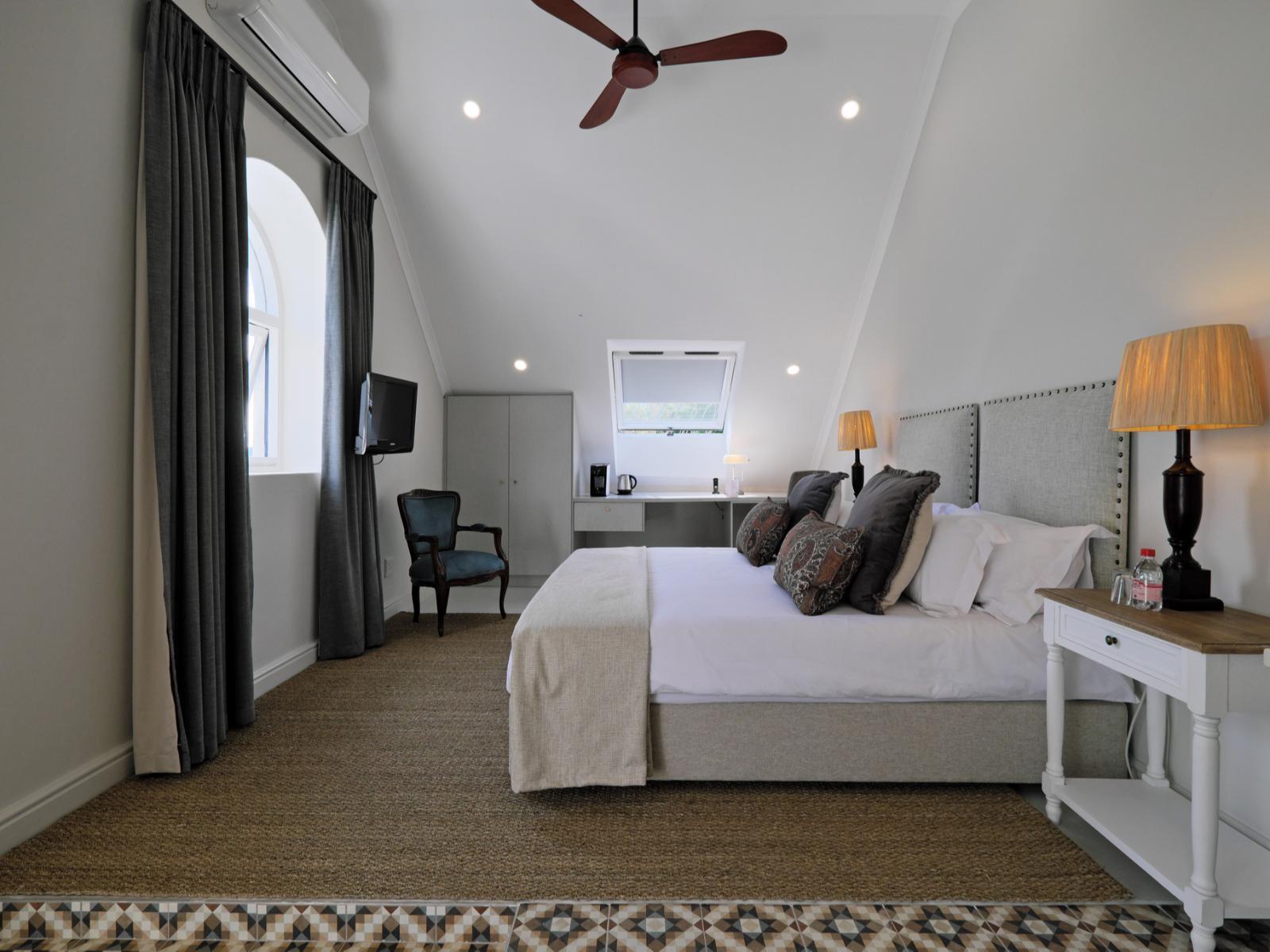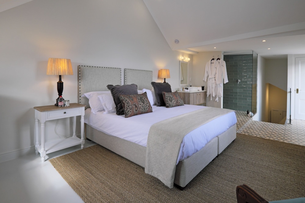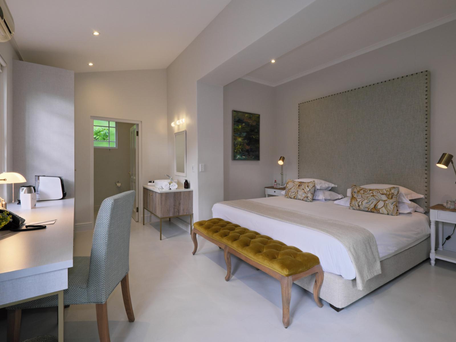 The recent renovations have captured many of the original features and restored them to their former glory. The décor is simply captivating, impressively combining heritage design with local creativity, charm, and color. The public areas of the hotel benefit from enormous attention to detail, including bespoke art pieces from local artists, and handpicked furniture and fabrics. The breath-taking lounge boasts exceptionally high ceilings and a strikingly generous original fireplace. The reception area leads into a bar and terrace overlooking the pool to one side, and the beautifully paneled breakfast room to the other side. The breakfast room unfolds on to the original veranda and on to a glorious garden of roses, lavender and beautiful indigenous trees creating an oasis of calm and relaxation against a backdrop of the Franschhoek mountains.