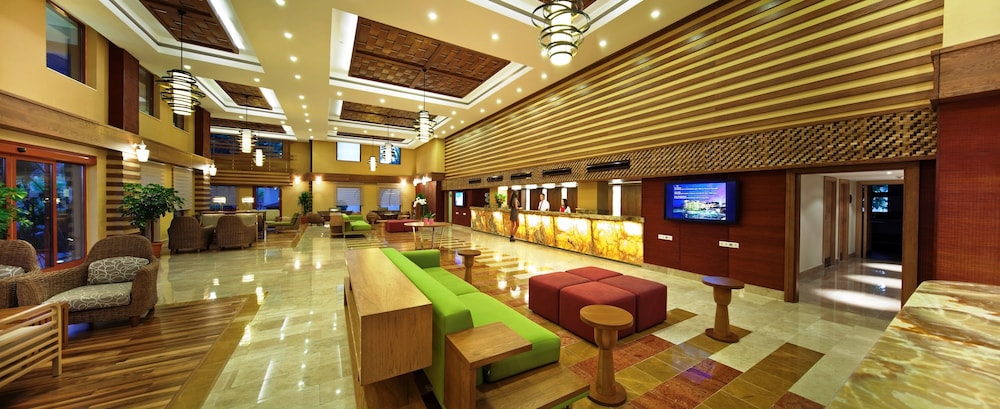 Club Grand Side, which is shown as one of the most preferred by the European families throughout in Turkey, is a 5 star holiday village with its blocks having 3 floors, its expanse beach, deep blue waters, very green tropical trees and vegetation. The great facility Side, having an area of 75.000 m ,is in olakli Beach, 55 km. from Antalya Airport and 9 km. from the Antik Side. The spacious lobby, 3 restaurants competing in taste, 4 bars where you can cool off with Turkish alcohol and nonalcohol drinks, 3 meeting rooms, beauty center, sports center, sauna, Turkish bath, massage, indoor swimming pool, 2 outdoor swimming pools, Amazon Water world Aqua park and small shops where you can meet all your needs for shopping, are all in your service. Totally 540 rooms new decorated in different features, with details glorifying the concept, comfort. All the rooms include central air condition, satellite LCD TV, safety box, hair drier and direct dial telephone, W-LAN ,minibar. In our main restaurant, having all kinds of Turkish and world tastes, the breakfast, lunch and dinner are served in open buffet. Away from this colourful show, for a banquet special for you, you can have a memorable evening in Atlantis and Pomodora a la carte restaurants where we offer distinguished tastes compiled of Mediterranean and Italian kitchen. For our guests carrying the night to late hours, late breakfast, night food and tea-pastry hour are also included in our service. You can have pleasant time with the ones you love by both enjoying yourselves and relaxing in 2 outdoor swimming pools founded in a large area, children pool, indoor swimming pool and Amazon Water world . AMAZON WATER WORLD The most naturel & biggest water and entertainment park in Side-olakli Water and entertainment Park , founded in 14.000 m area at the Club Grand Side . The Water Park having 4.500 m area , wave pool ( 1.100 m) , river rafting (130 m long) , lazy river ( 550 m long ) , water and fog cave ( 500 m) , childrens pool ( 80 m) , Swimming pool with 7 water slides (170m) ,game centre , restaurant and 3 bars and Disco. All the water facilities ,food and beverage services free of charge for all the guest . HEALTH & BEAUTY CENTER You can find all kinds of care and sport opportunities in our fully equipped beauty center. Heated swimming pool, children pool, fitness salon, Turkish bath, Sauna, aroma therapy massages, slimming with lpg, skin and body care programmes are ready for your relaxation. ACTIVITY & ENTERTAINMENT 10 Tennis courts (Sand surface , together use with Club Grand Aqua guest) , table tennis, beach volley, bowling, billiards and different kinds of computer games, water sports, sport activities and competitions, day and night animations, live music, mini club mini disco and children park for 4-12 aged kids are all in service for children and adults, for them to have an enjoyable holiday. MEETING ROOMS All kind of meetings, seminars and conference organizations are held in our meeting rooms. Our Olympos salon caters for 300 people, Belkis salon caters for 500 people, Pamfilya salon caters for 200 people, Phaselis salon caters for 75 people. RANI FARM Rani Farm was founded in 1993, by Sezer Group so as to produce qualitative and healthy food for their hotels. All kinds of meat, delicatessen milk, milk products, kinds of cheese are produced in Rani Farm naturally and in top hygienic environment, according to ISO 22000 rules. Moreover, many kinds of fruits and vegetables are produced naturally, without adding additives and hormones. While guests are having a happy holiday with their family, it will also be possible for them to eat a healthy and natural diet.