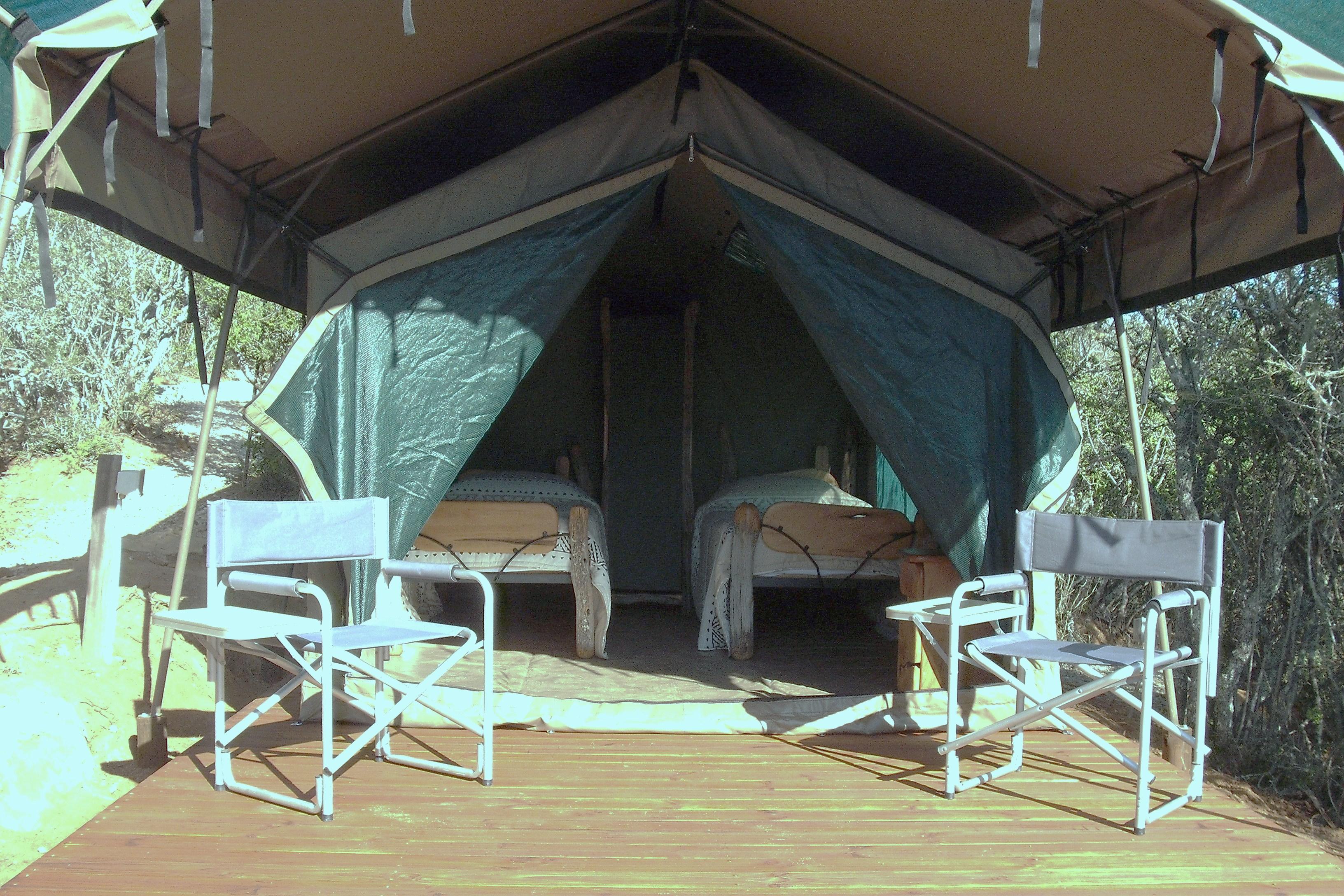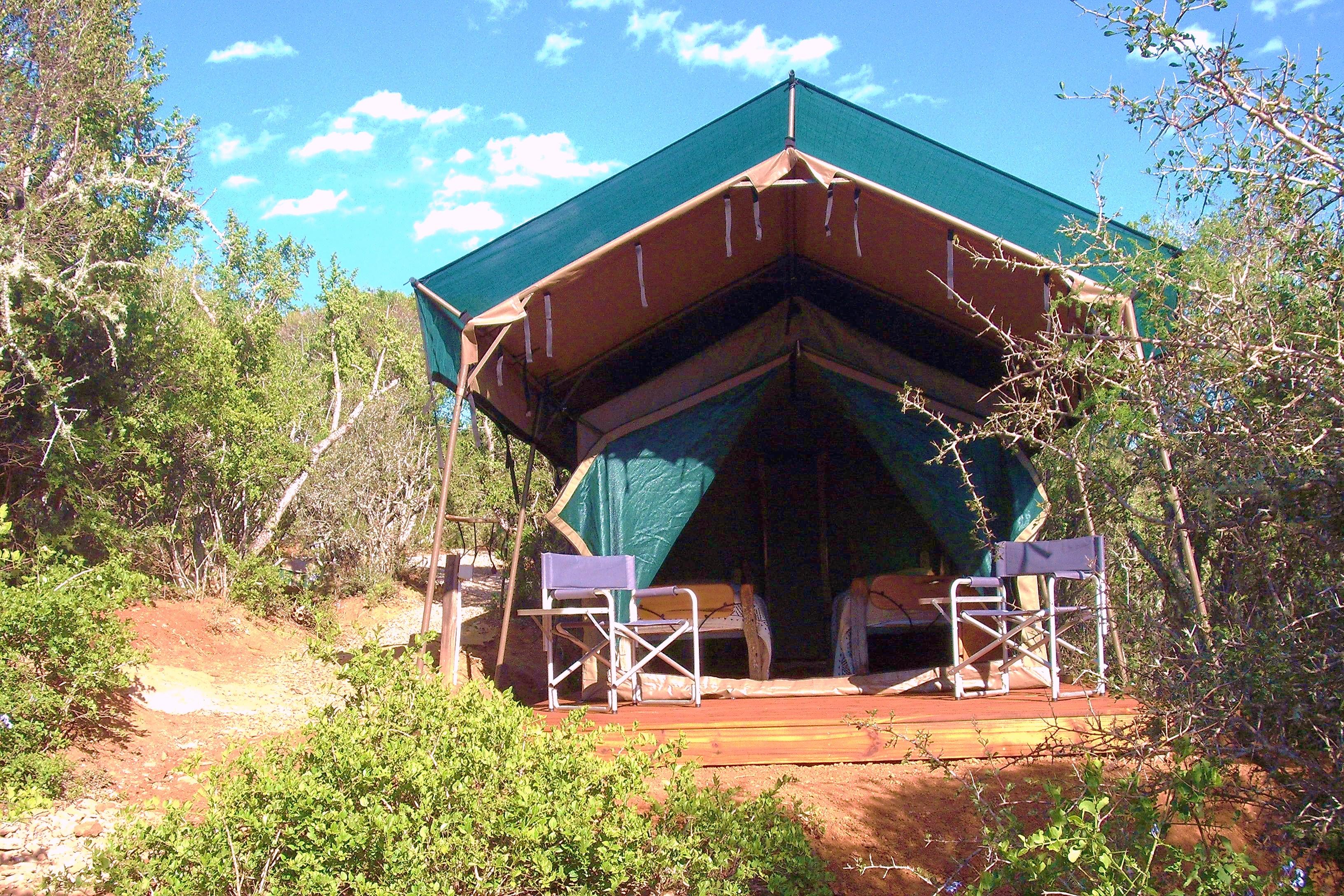 Situated just 20 minutes on the East London side of Grahamstown, approximately halfway between Durban and Cape Town, Coombs Camp is an eight bed, tented bush-camp, nestled in amongst secluded Eastern Cape valley-forest. The reserve is teeming with a variety of bird species and small game and is an ideal retreat for nature lovers. The lodge is set on 80 ha and is stocked with small game. We are not a Big 5 type reserve with lions snapping at your heels, champagne game drives and the like - it's do-it-yourself territory. We are self-catering only, and guests are responsible for all