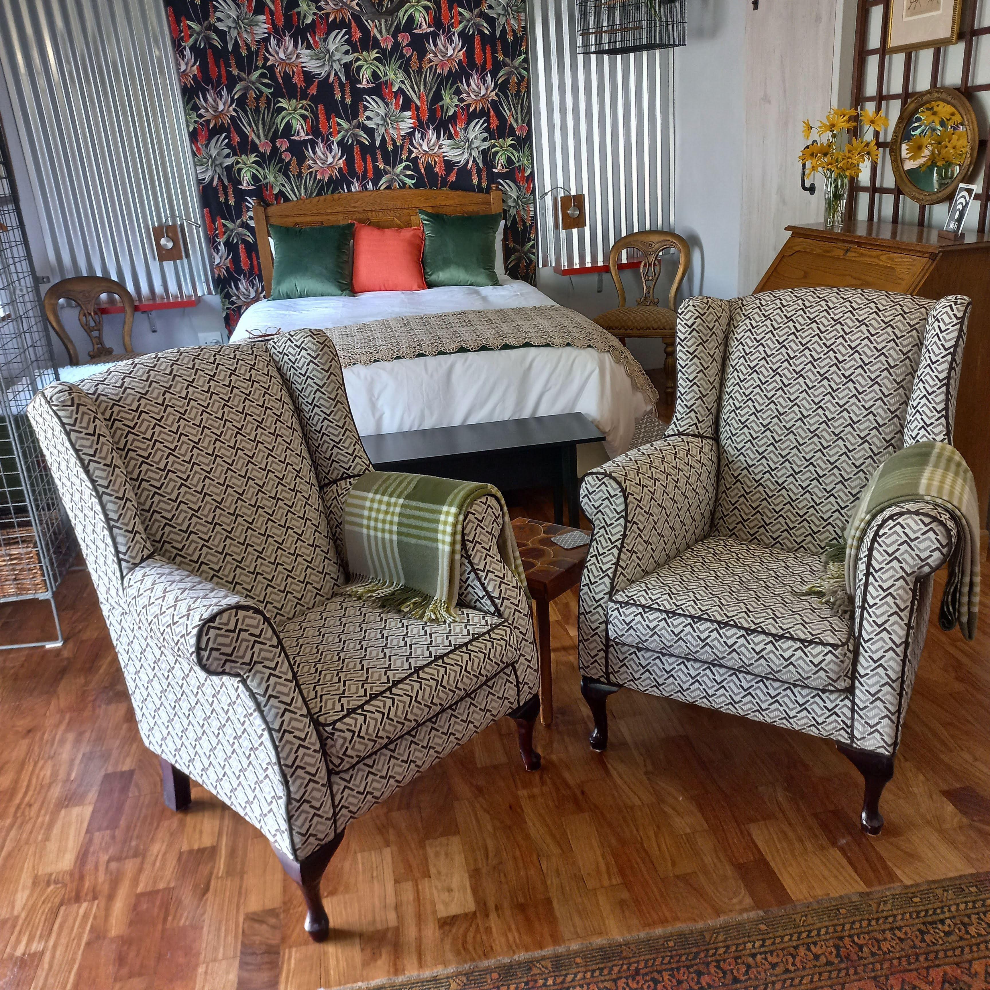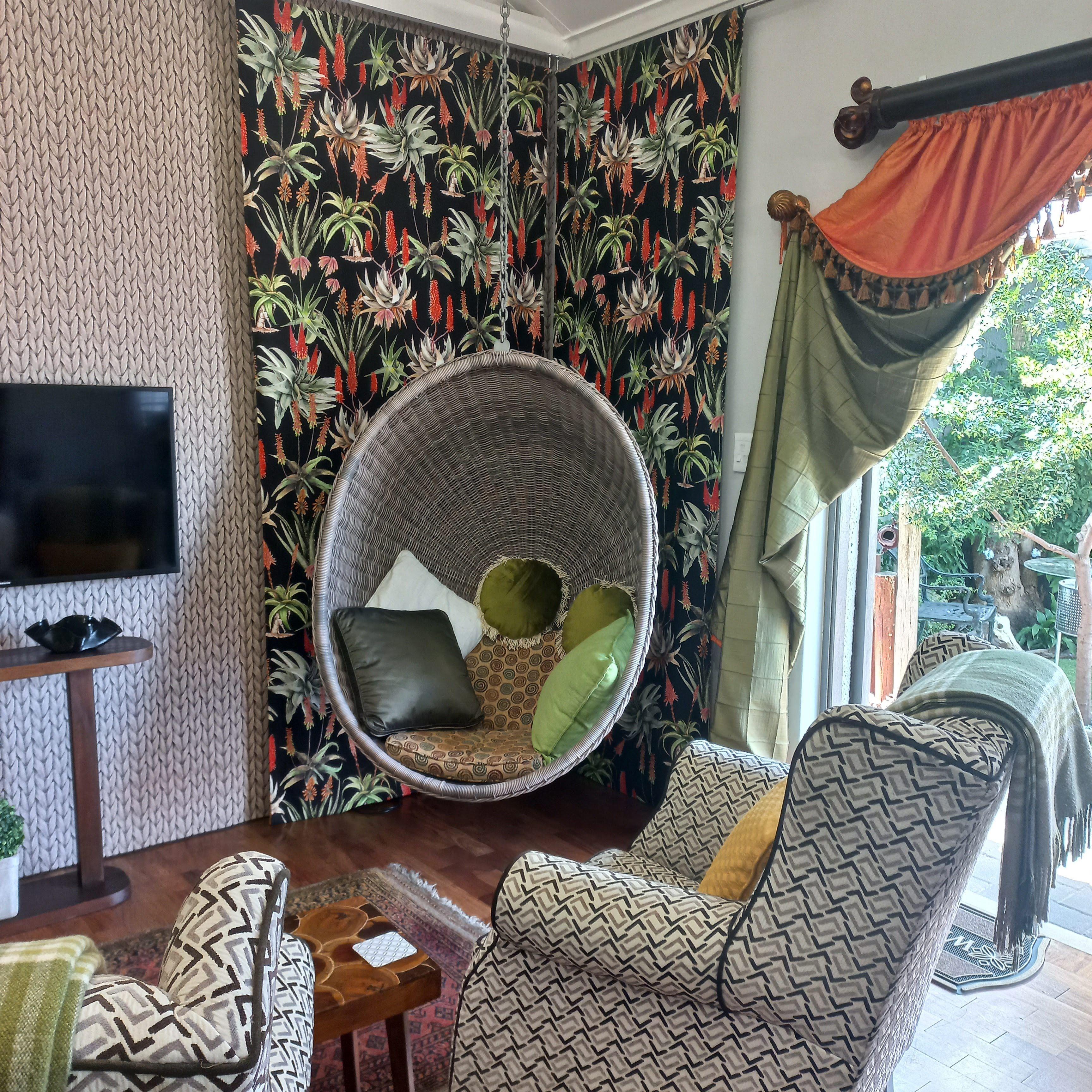 The lounge has a 43" TV with DSTV Premium, Netflix, Showmax and Amazon Prime. There are two comfortable wingback armchairs and a hanging chair for relaxing.