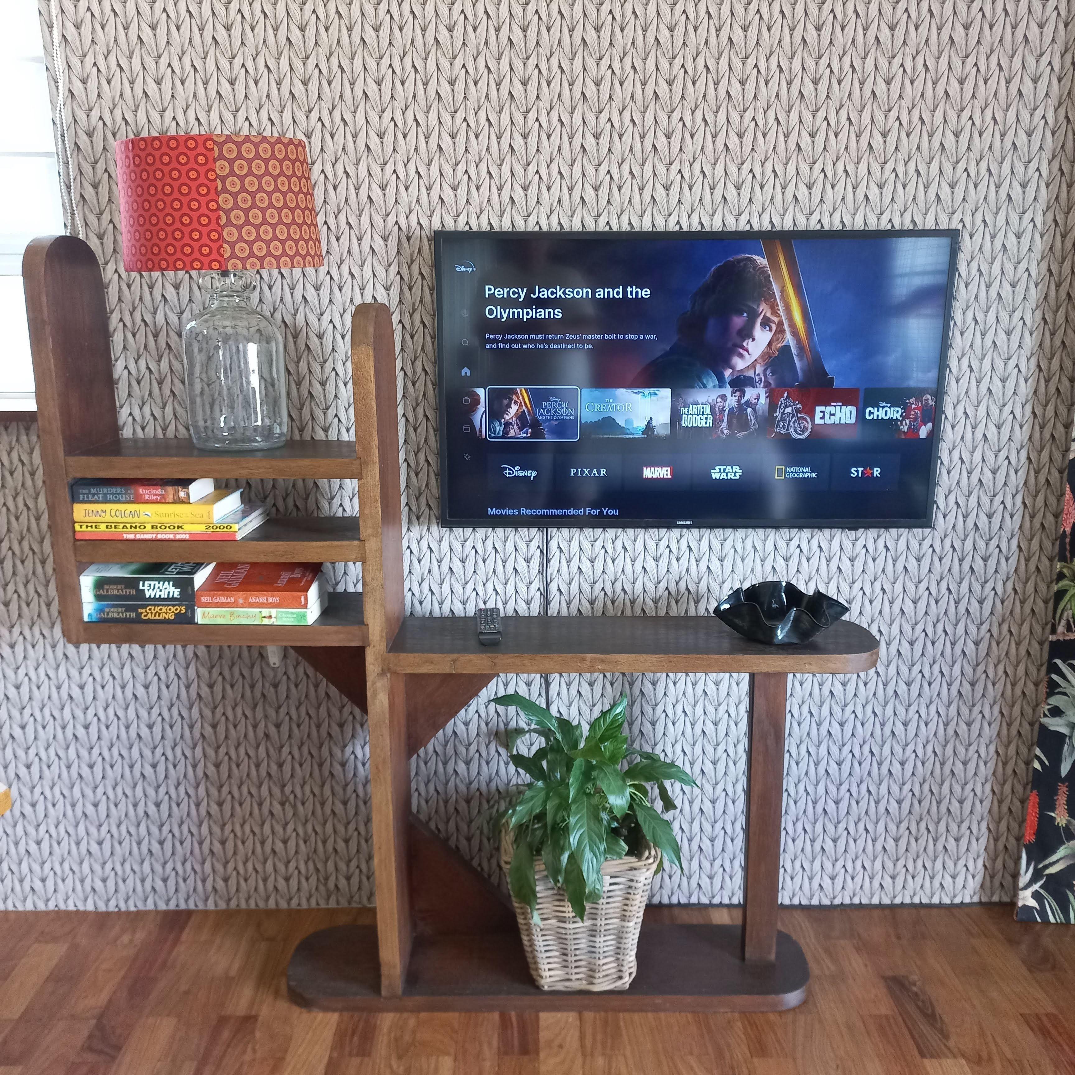 A vintage writing bureau is used as a dedicated work station. The WiFi router has its own UPS for its fibre connection, so it is always on during loadshedding.