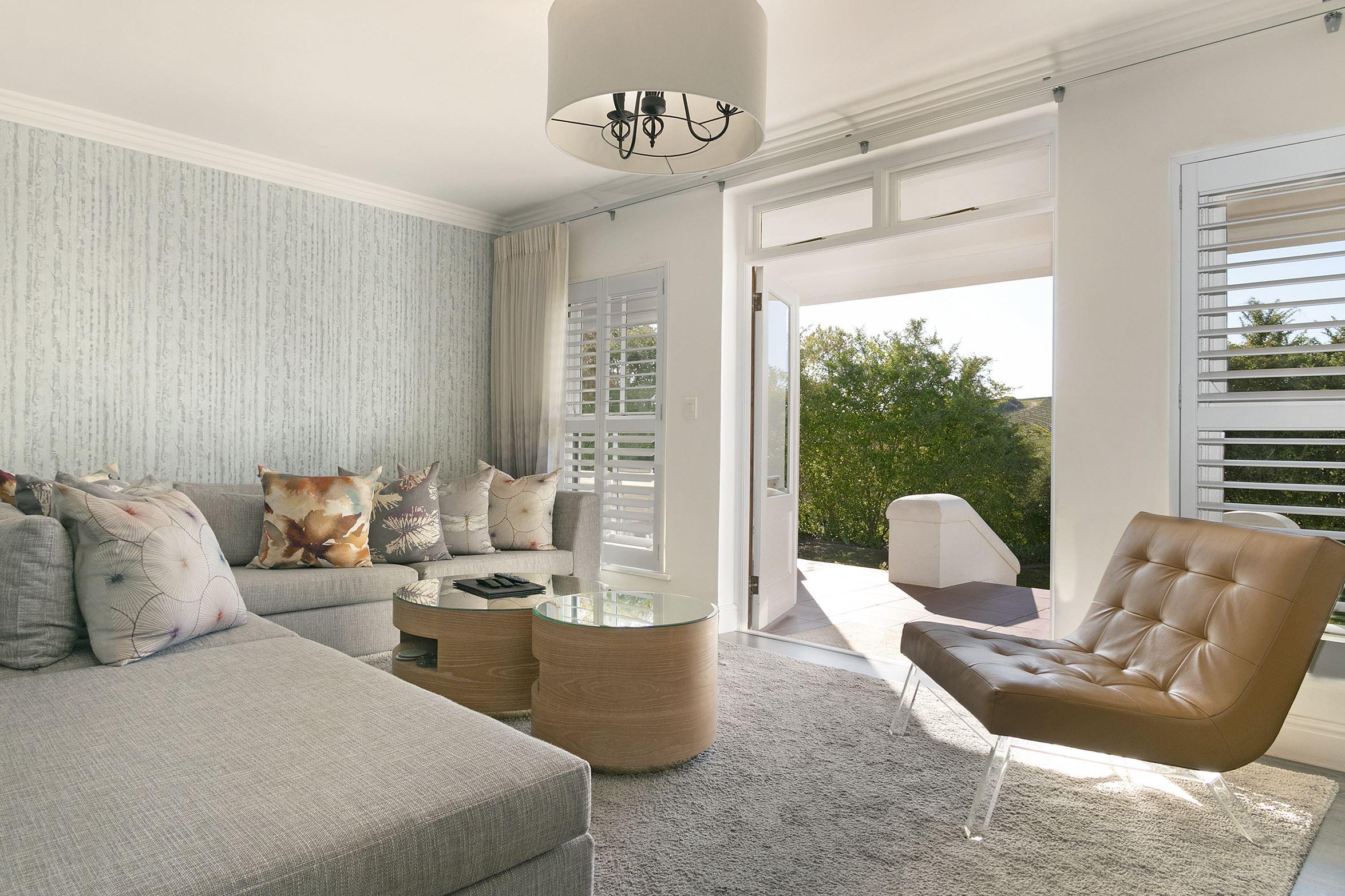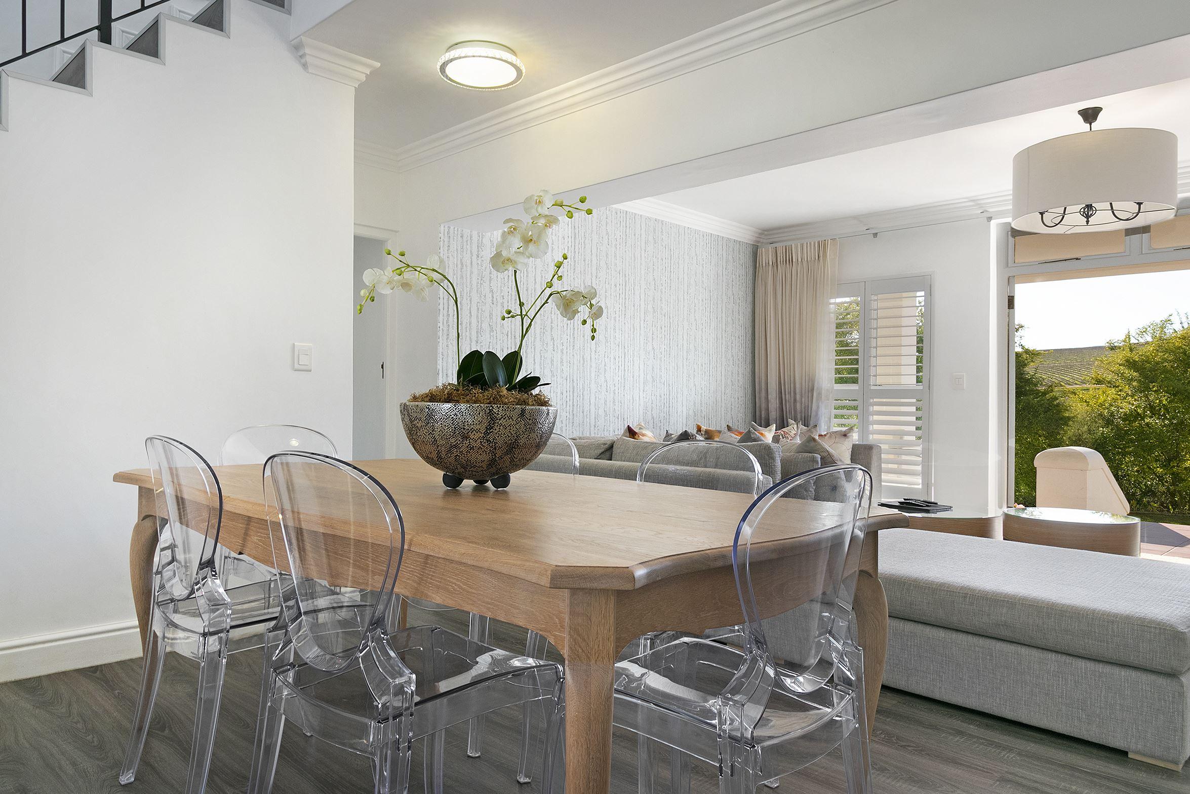 De Zalze 3 is located on a golf estate within the Helderberg Wine Valley. Quiet, modern luxury and unrivalled comfort makes this holiday home that much more special. Panoramic views of surrounding greenery and Rocky Mountains further elevate the appeal of this home away from home.De Zalze 3 sports a gorgeously neutral and modern interior. An island-style kitchen area, providing you with all the must-have appliances, is spacious and more than suitable for all your culinary needs. The kitchen leads into the open-plan living/dining area, where the dining room table can sit up to six g