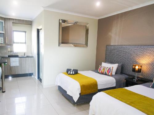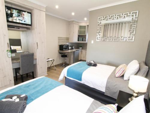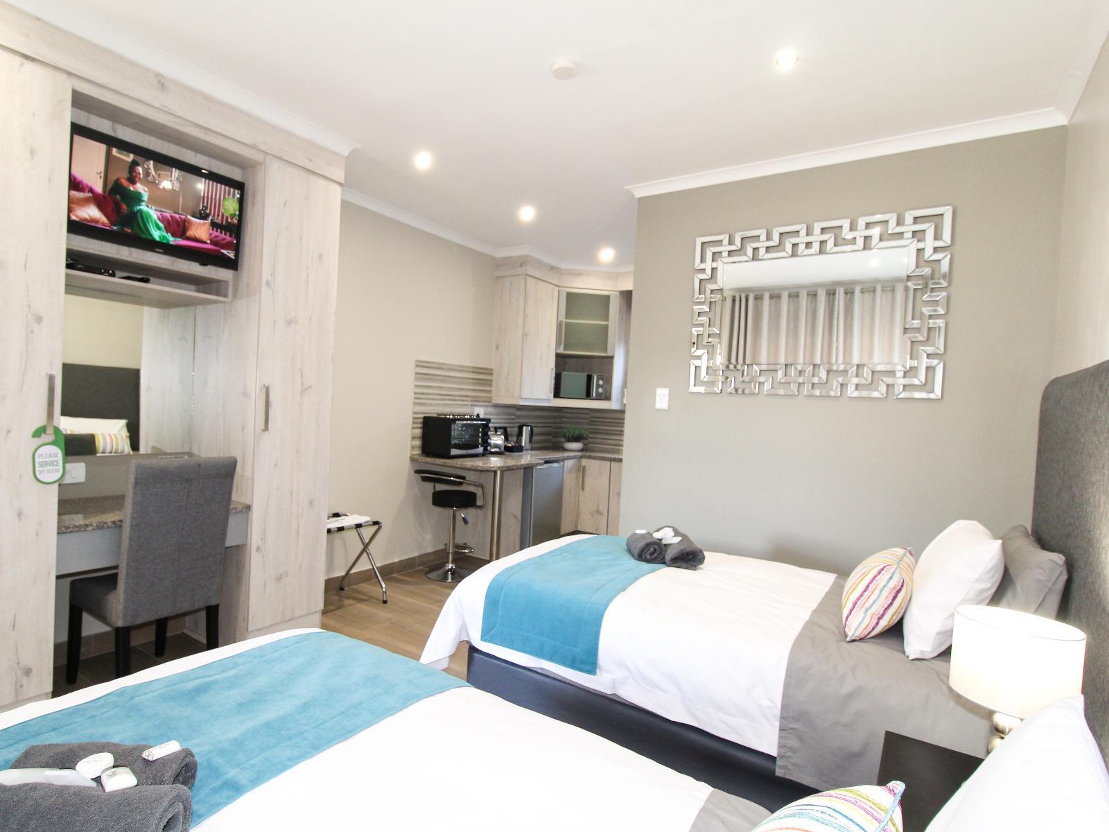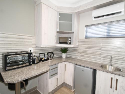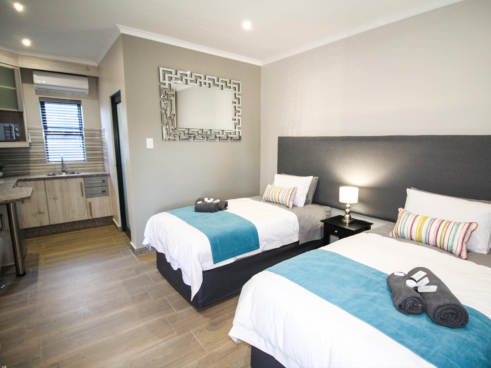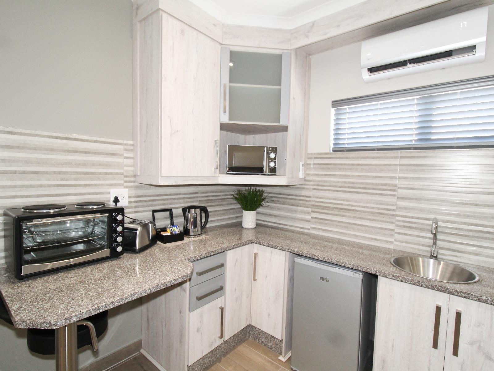 De Stroom Guest Lodge offers 5 modern self-catering rooms, each fitted with either two three-quarter beds or a queen-size bed. Stylishly designed for comfort, the rooms include air conditioning, Wi-Fi, and all the conveniences of home.All rooms feature a television with DStv and a fully equipped kitchenette including a bar fridge, microwave, mini oven, stove, and basic condiments such as coffee, tea, and sugar. Each room has an en-suite bathroom with a shower, toilet, and basin. Fresh towels and toiletries, including shampoo, conditioner, and bath gel, are provided. Hairdryers are