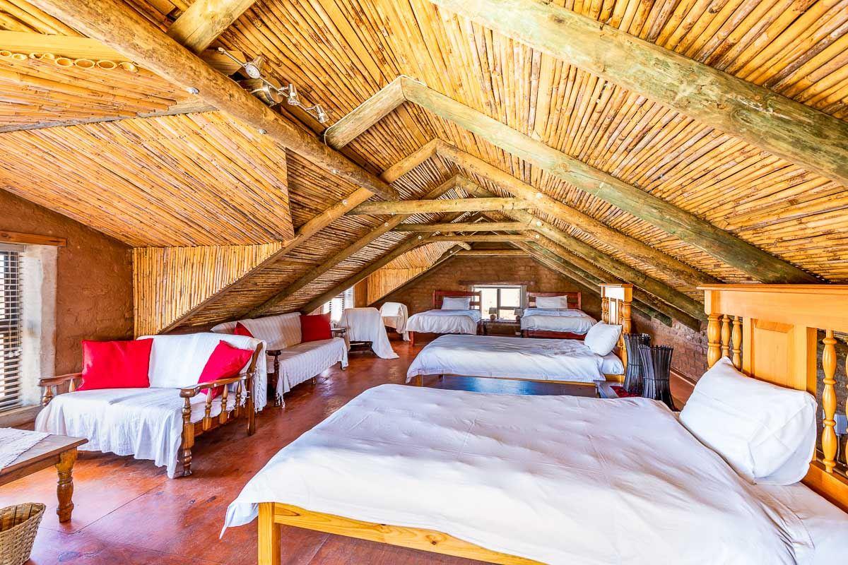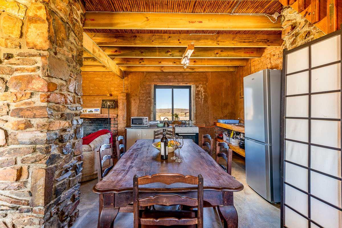 Die Rooidakhuis.Die Rooidakhuis is also nested in Aloe Canyons Wildlife and Guestfarm. It can accommodate up to 8 people. The house comprises 2 bedrooms and a loft and can accommodate 8 guests at a time. The main bedroom has a queen-size bed and an en-suite bathroom. The second bedroom has a double bed and a seperate bathroom, to share with loft room. This loft has 4 three-quarter beds and share bathroom with second room Towels and linen are provided for guests' to enjoy and for there convenience.The units on the farm are located far apart from one anot