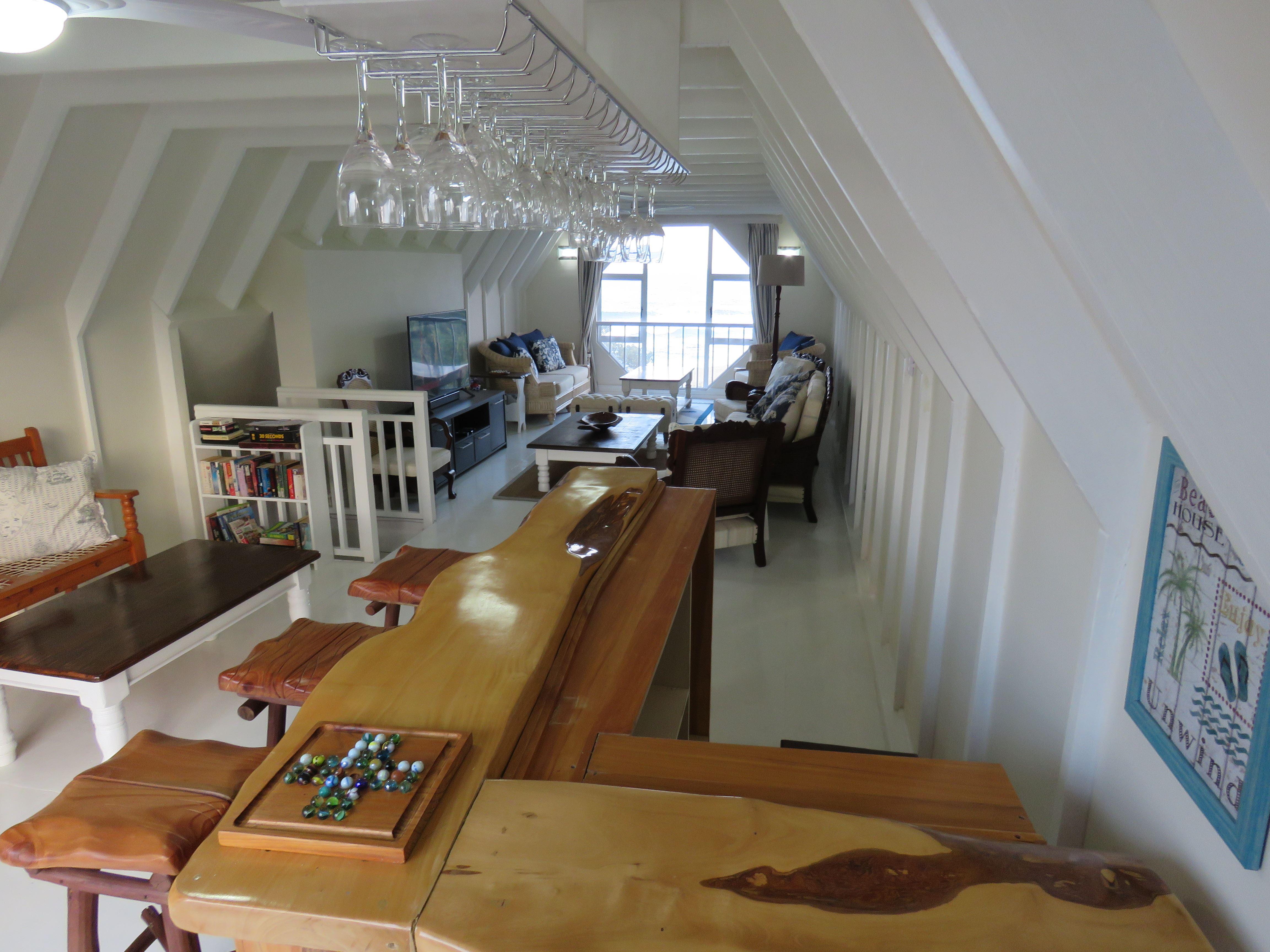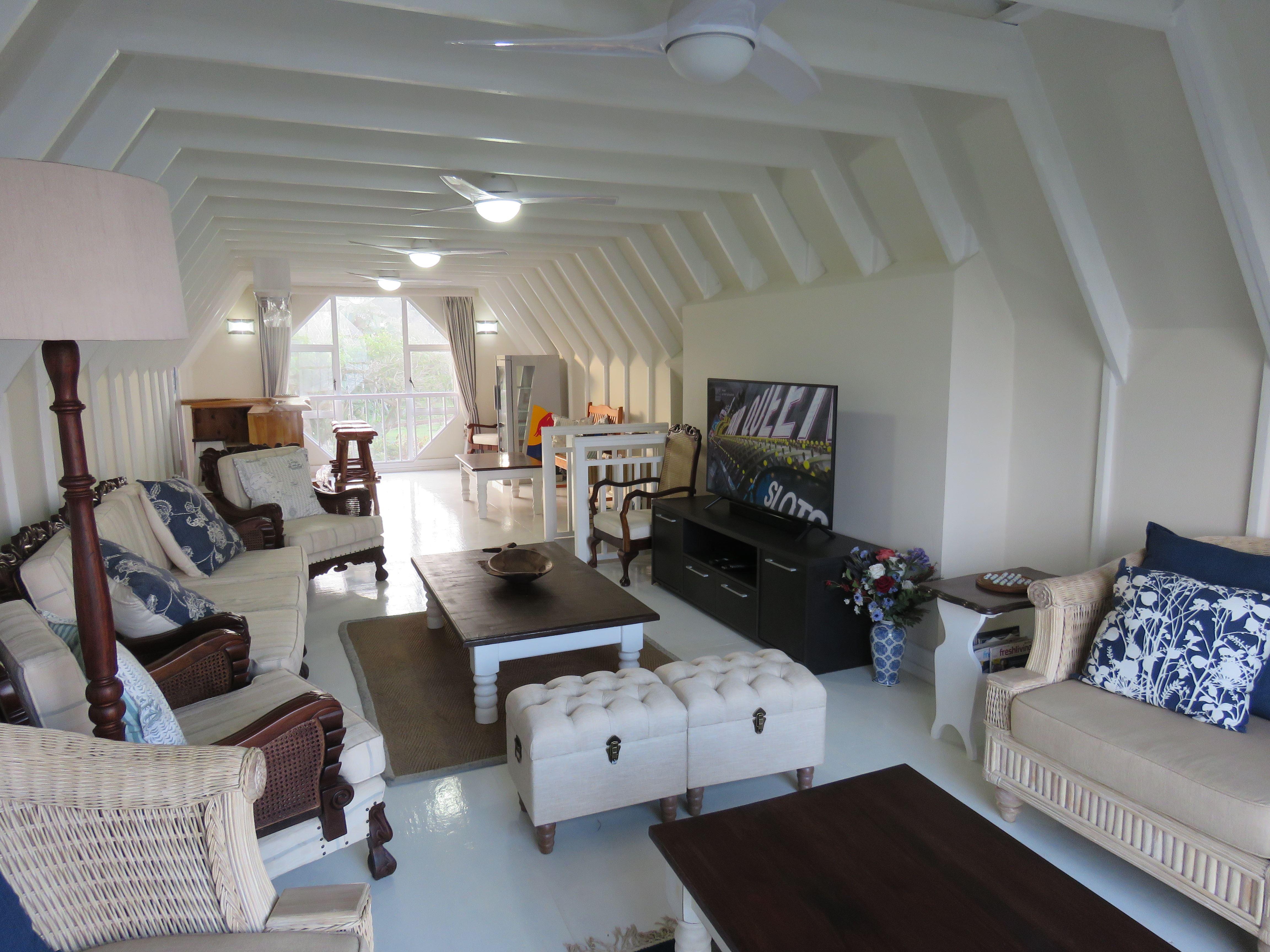 This KwaZulu Natal South Coast self-catering, beachfront house is a modern oasis for the city weary. Our front garden gate opens onto a narrow strip of indigenous vegetation (admiralty.It all that separates you from the beautiful blue flag Southport beach.Besides being a very popular KwaZulu Natal South Coast fishing beach, Southport is conveniently situated in close proximity to many delightful restaurants, golf courses, bowling greens and shopping facilities.Dolphin Place accommodates 16 people in seven bedrooms and five bathrooms. It has a central commun