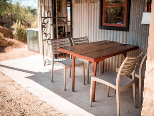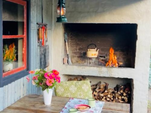 The cottage is completely off the grid, utilizing, solar, gas and wood for energy. The kitchen is fully equipped with a gas stove and oven, fridge-freezer, tea and coffee facilities, and cutlery and crockery are provided. Fresh milk and farm butter are provided in the fridge and rusks are available in the pantry. The kitchen opens onto an undercover back patio with a built-in braai area and dining area.