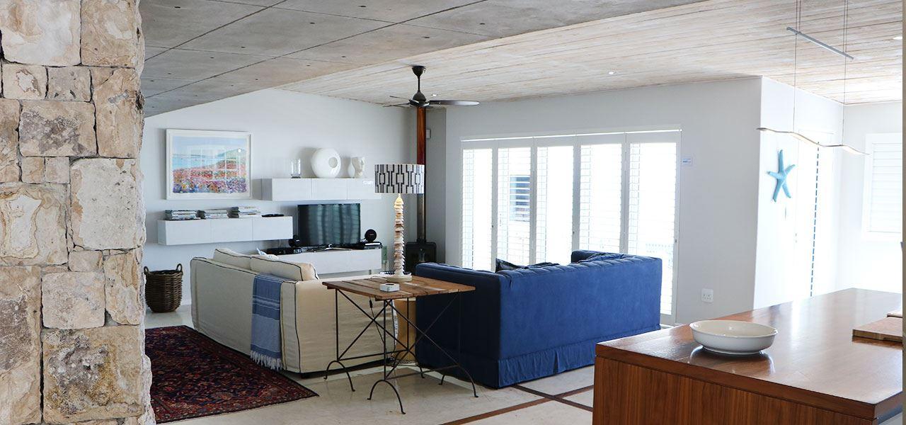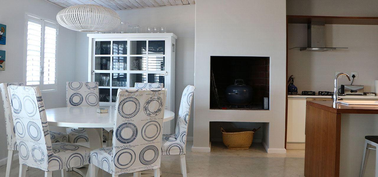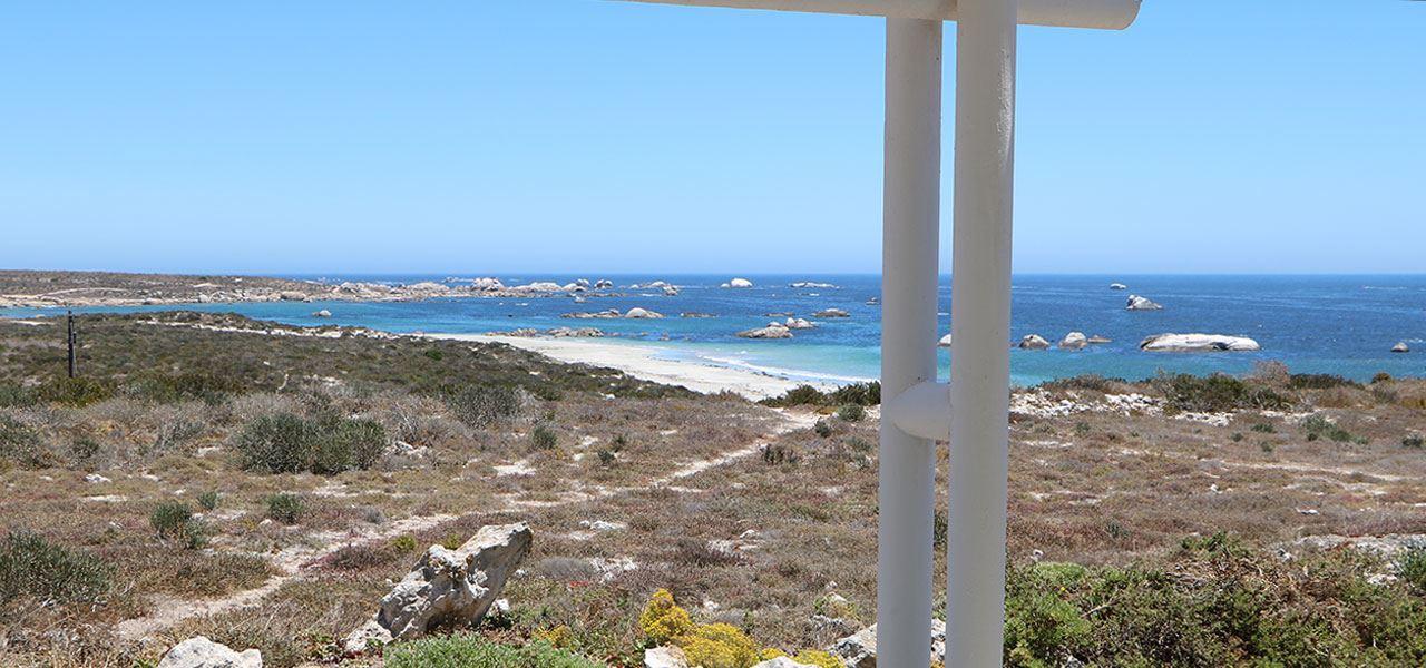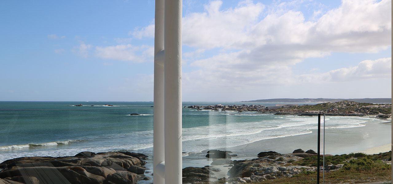 Dune Ridge Main House is a luxury self‐catering holiday house located right on Bekbaai beach in Paternoster, in the Western Cape. It faces north across the bay with a panoramic 270-degree view of the ocean. Due to the design of the house one feels in touch with the sea and nature all the time. The house is 2.4 kilometres from the Columbine Nature Reserve and the Cape Columbine Lighthouse.The house features three en-suite bedrooms. The main bedroom has great sea views and features a full bathroom with a bath, shower and king-size bed. The second bedroom boasts sea and li