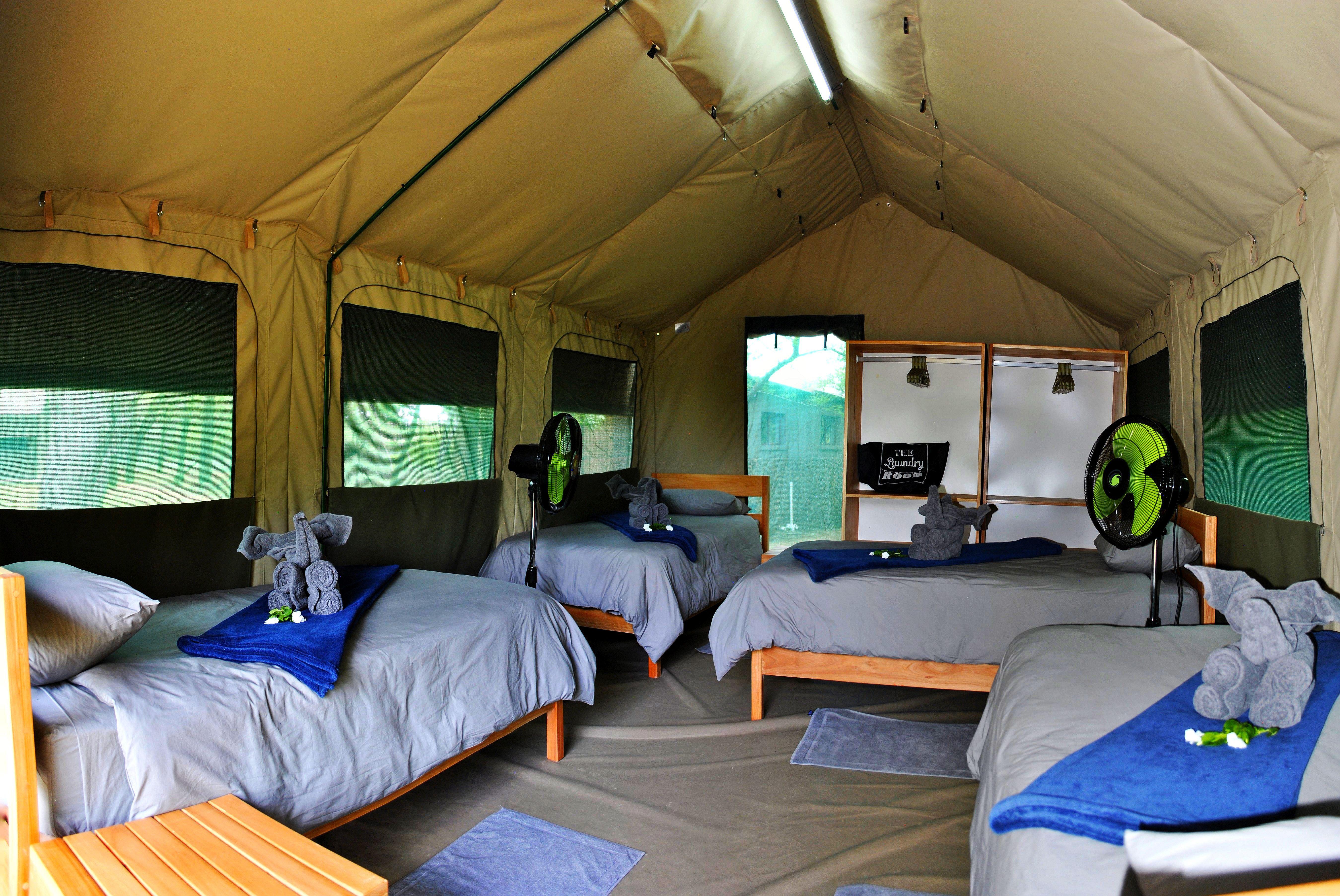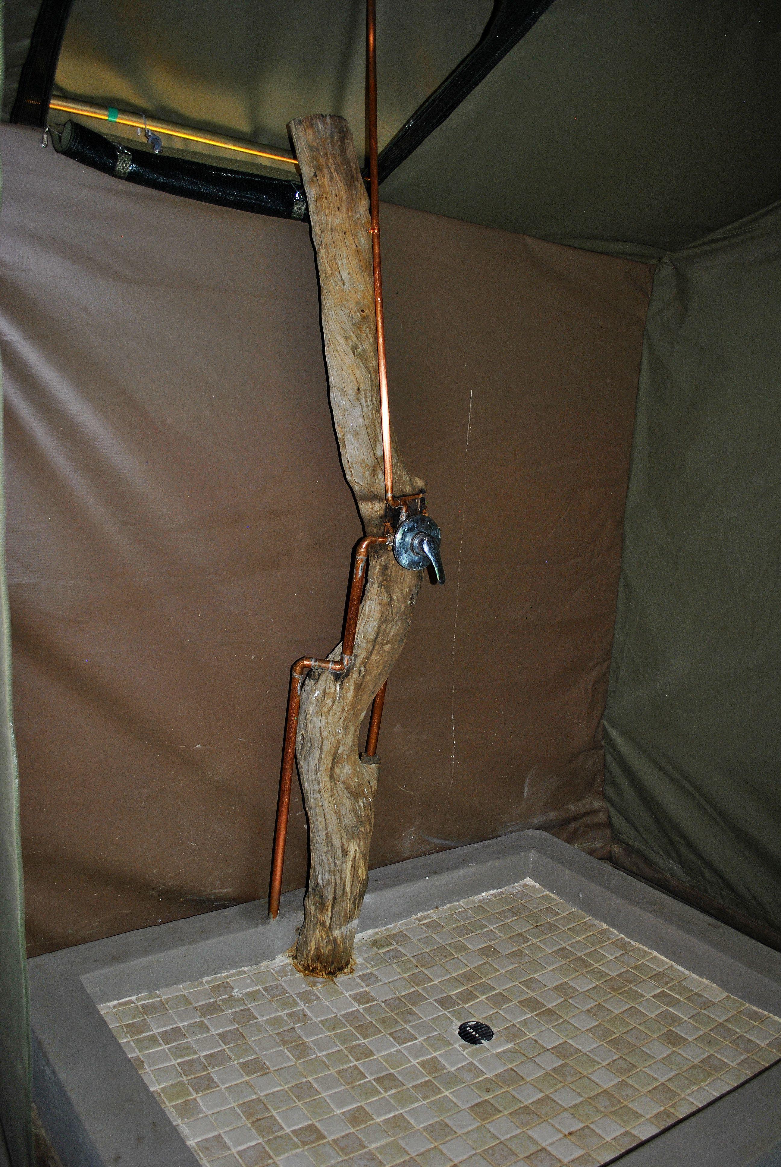 The first four tents include four comfortable single beds and rustic ablutions. What a way to freshen up in our ablution area, which has three showers, three toilets and three basins.