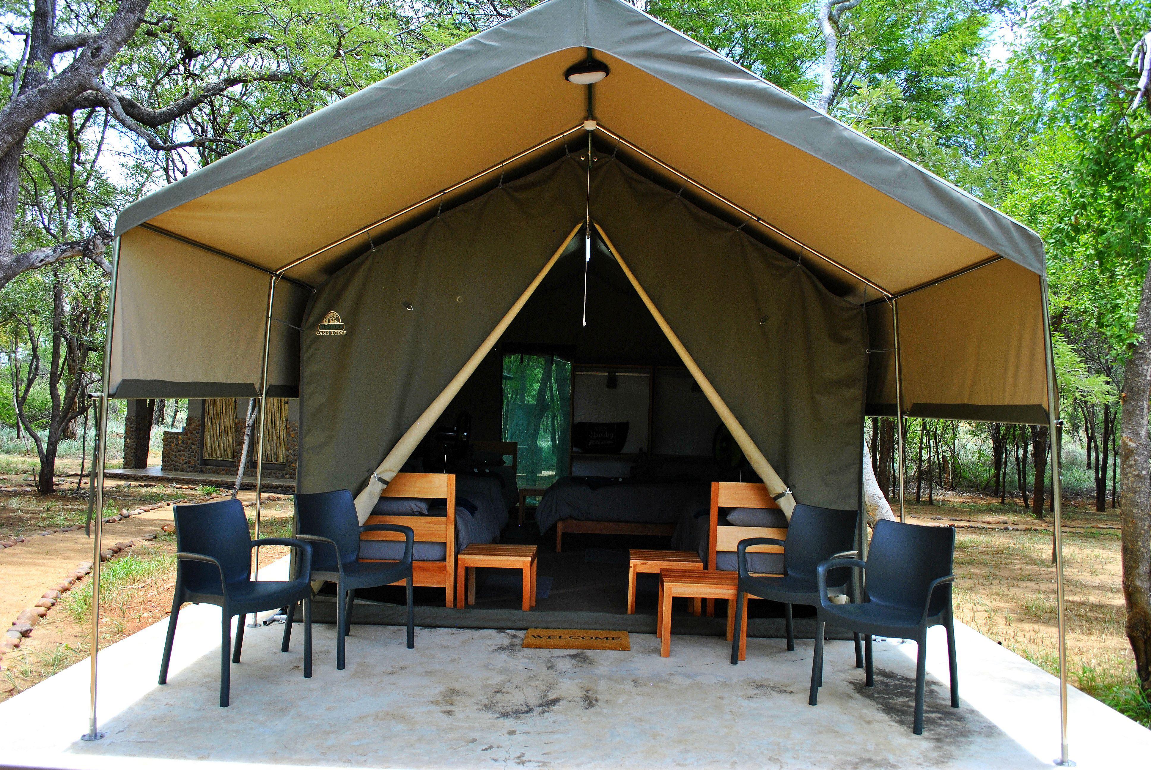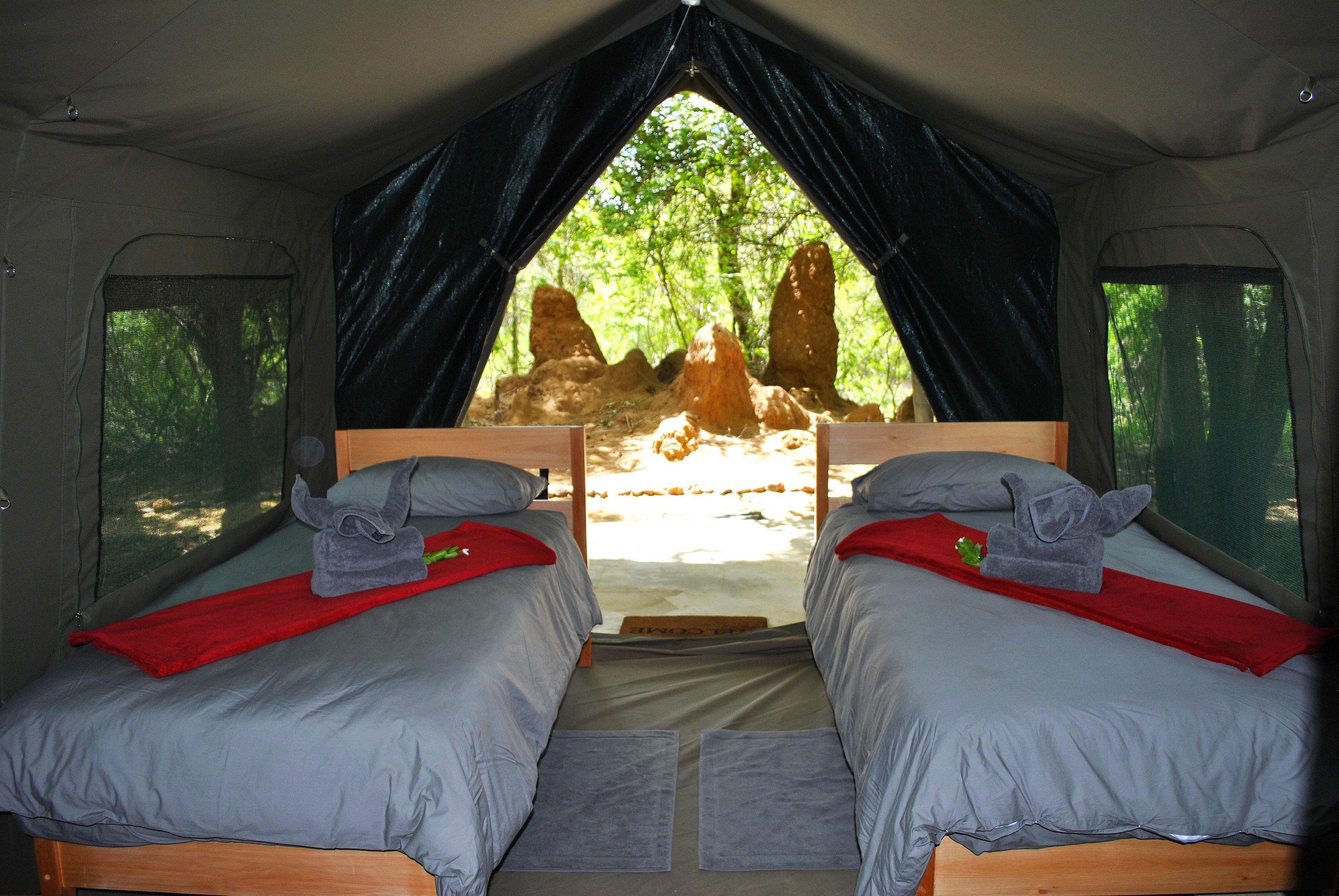 The other two tents comprise of two comfy single beds with en-suite bathrooms (toilet, shower and basin). Each tent has an extended concrete verandah, which is a prime vantage point for game viewing and ideal for students wanting the additional comfort overlooking the surrounding bush, Selati River bed and bird viewing.