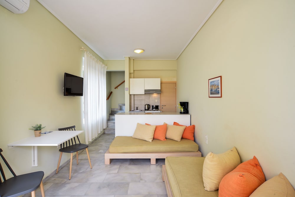 Located in an olive plantation of 7000 square metres, it is just 350m from the fantastic beach of Agioi Apostoloi and Chrissi Akti and 4 km away from Chania town. Big green gardens of flower and palm trees welcomes the visitor. The surrounding fields of olive, orange, wine and lemon trees live in harmony with the villas stone architecture and compose a beautiful landscape that promises to give the guest moments of quality and relaxation.This is a small luxurious villa complex that comprises 2 storey villas.They are a blend of modern Greek design together with the traditional rustic mansion of the Cretan village.The villas are stone built and consist a kitchen and the sitting room with a big sofa and the fireplace. A big glass door opens to the terrace and the garden where a private swimming pool and children pool lays just in front. On the ground floor there is one more bedroom with a double bed and a separate bathroom, which also has access to the pool area through a big glass window. On the first floor there is one more bedroom with double bed and a separate bathroom, as and an impressive balcony terrace of more than 70 m2 with view to the sea and the White Mountains of Crete.
