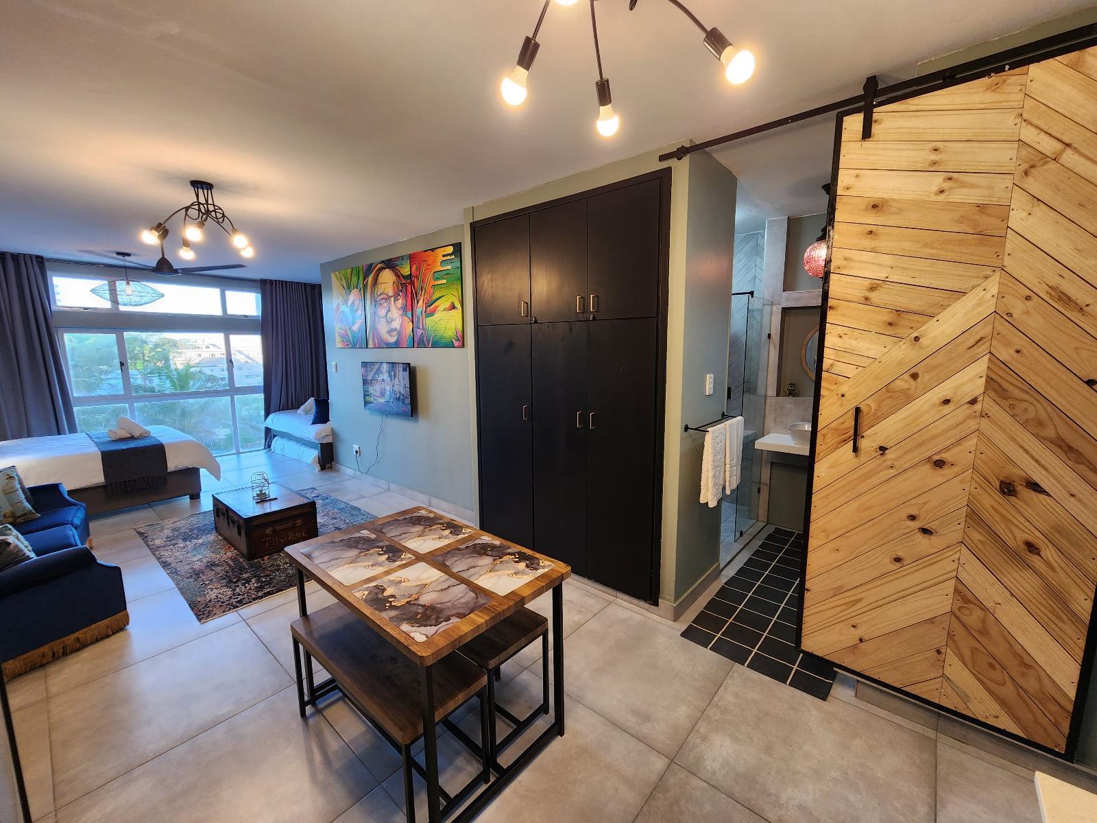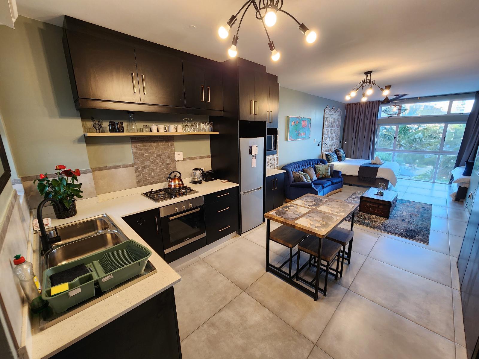 Waking up to views of the ocean, 203 Umdloti Holiday Resort offers guests a stylish stay in a gorgeous studio apartment on Umdloti’s Beachfront, within walking distance of shops and restaurants.The modern, open-plan apartment has all the bells and whistles to ensure a comfortable stay. Furnished with a queen-size bed and a single bed and a single floor mattress, the air-conditioned apartment has a stylish en-suite bathroom with a shower, a toilet and a washing machine. Black-out curtains will keep you dreaming until you're ready to take in views of the sparkling blue, warm Indian O