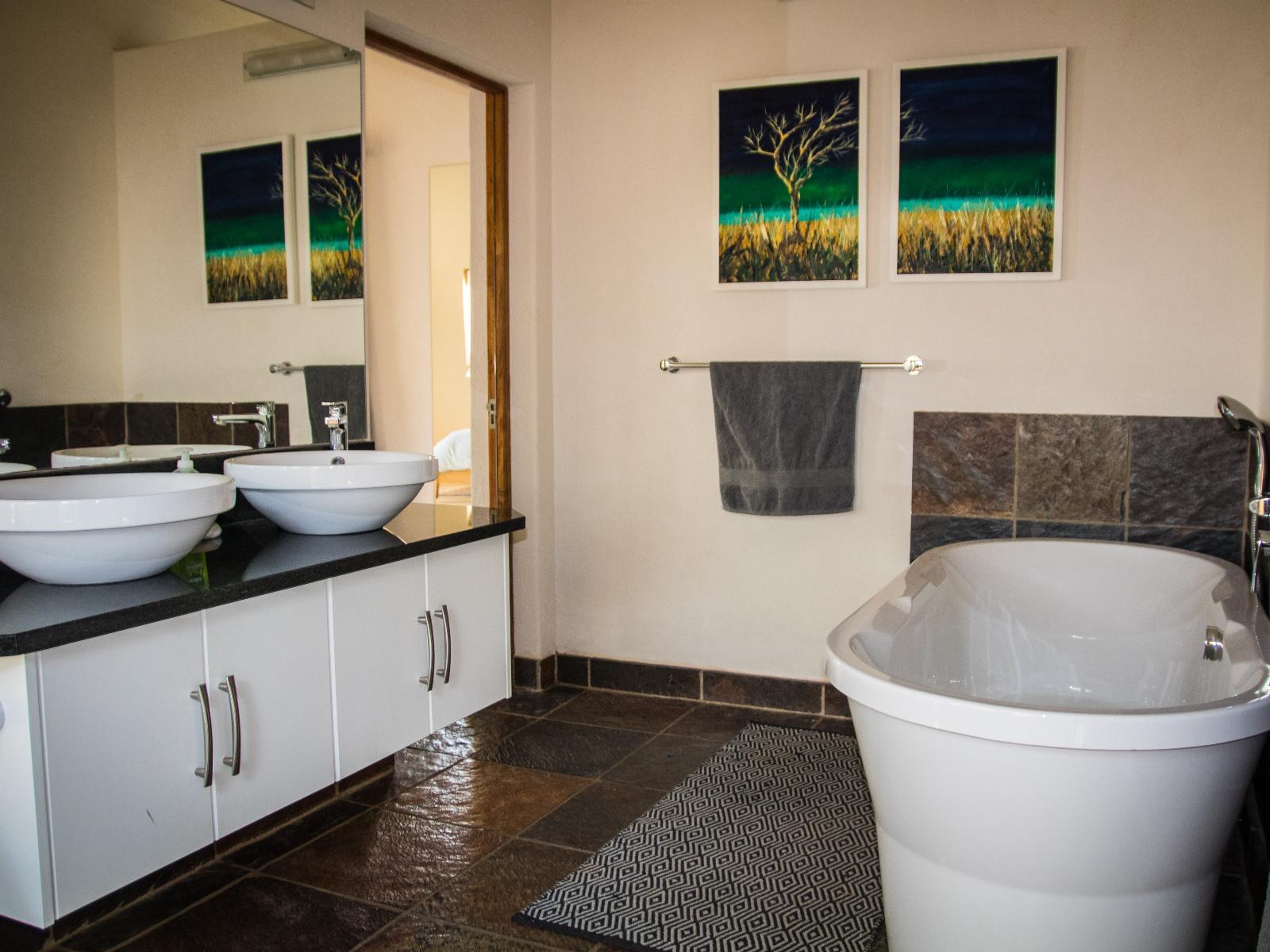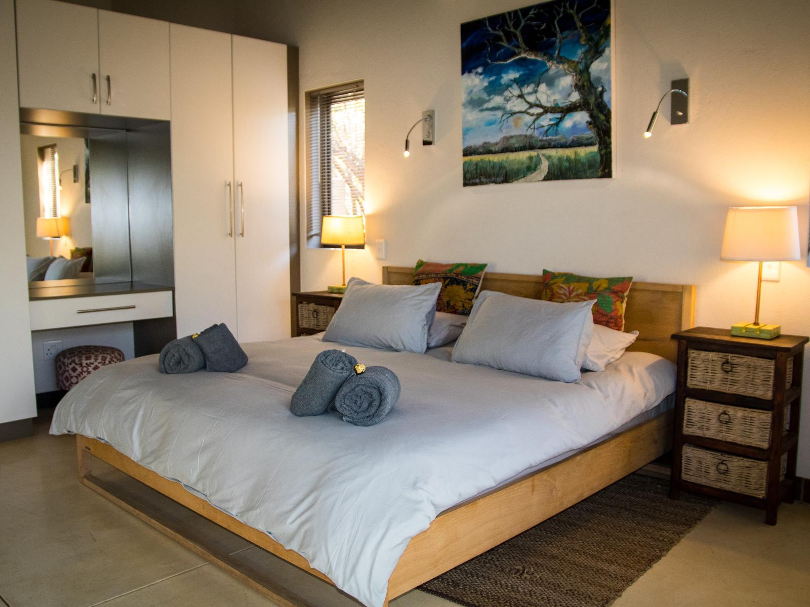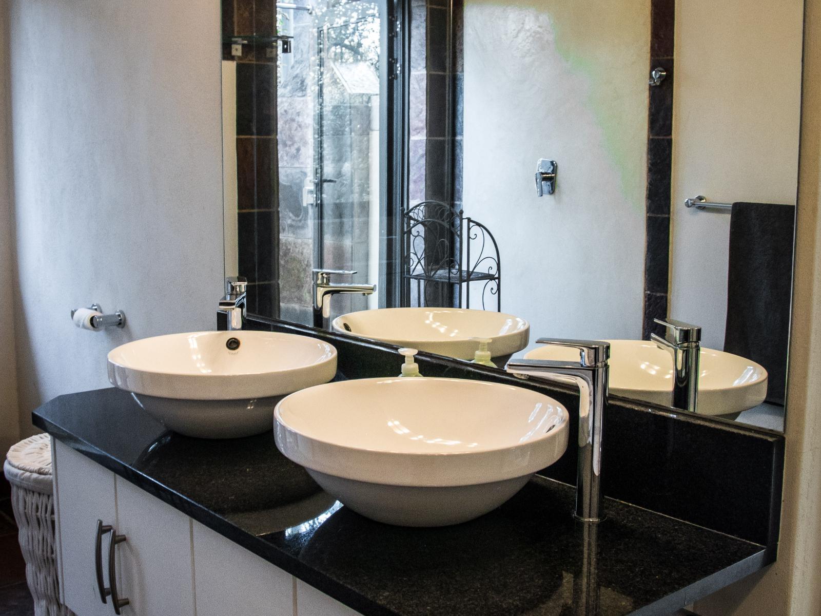 All bedrooms feature ceiling fans, dressing tables and bedside lights. Two bedrooms have king size beds and are ensuite with, double basin vanities, bath, indoor & outdoor shower and a private stoep. The other two bedrooms (one queen & one super king) share a bathroom with both bath & shower. There is an extra guest toilet in the common area.