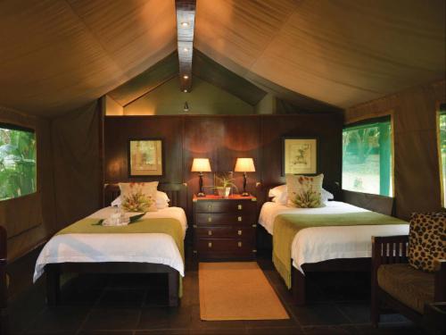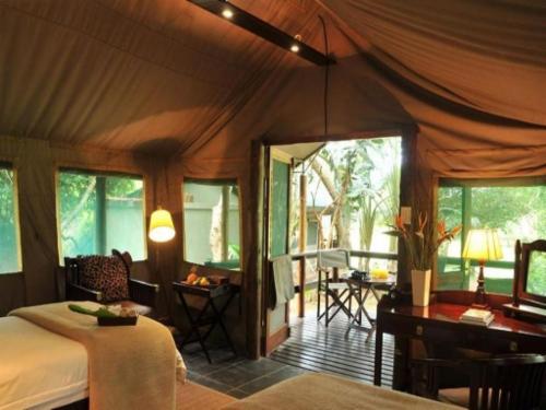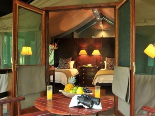 Guests can stay in one of 15 luxurious custom-built private tented suites located amid beautiful Sand Forest, each featuring a private living area, outdoor and indoor shower, and an outdoor bath.