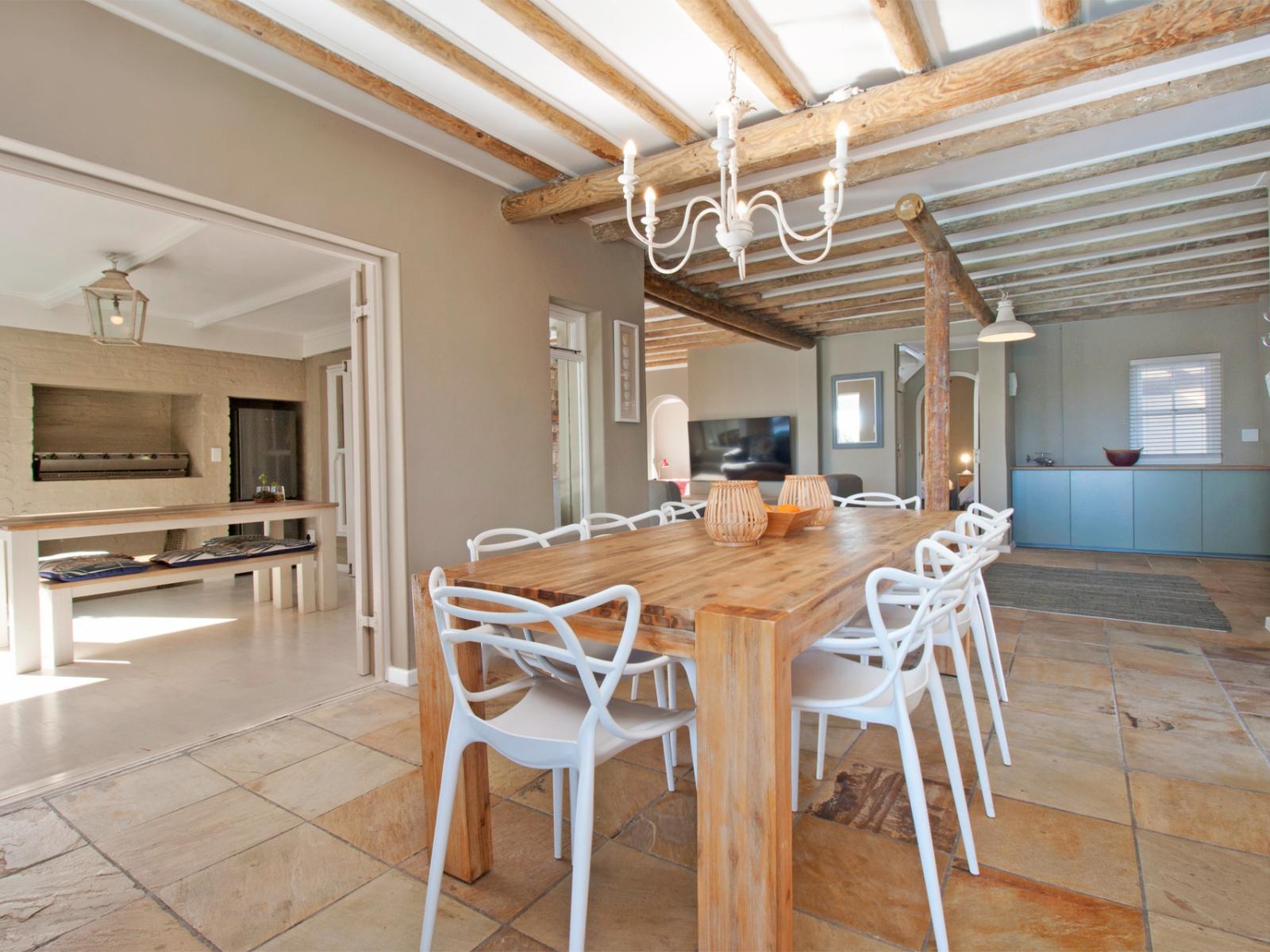 Fin Whale Beach House offers exquisite simplicity, embodying the essence of a splendid and family-friendly beach retreat. Recently revitalized and adorned with everything you need for an enchanting holiday, this haven beckons you to embrace tranquility. With a mere stroll over the dunes, you will find yourself surrounded by the pristine white sands of the renowned Long Beach, while being treated to breathtaking sea and mountain views beyond compare. Nestled within the upscale Klein Slangkop security estate, this residence exudes a captivating holiday ambiance that is truly unparalleled. Boasti