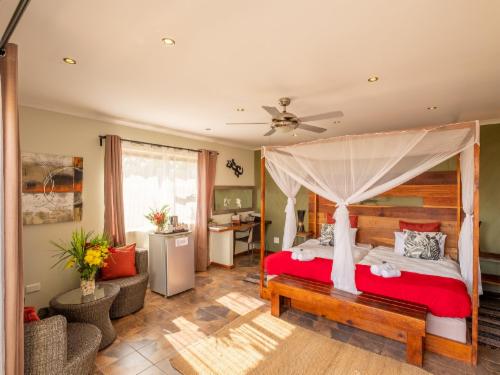 Situated on the outskirts of the beautiful and picturesque little coastal town of Swakopmund, Namibia, Gecko Ridge Guest House is a real oasis about 15 km from Swakopmund along the Swakop River. If you are looking for the ultimate in style and luxury, and wish to be pampered in a peaceful and tranquil environment, then this is the ideal accommodation destination for you. Beautiful wooden sun decks situated over ponds of running water allow for a well-deserved sundowner to be enjoyed, while viewing the amazing sunsets over the Namib Desert and moon landscapes. The gym, outdoor la