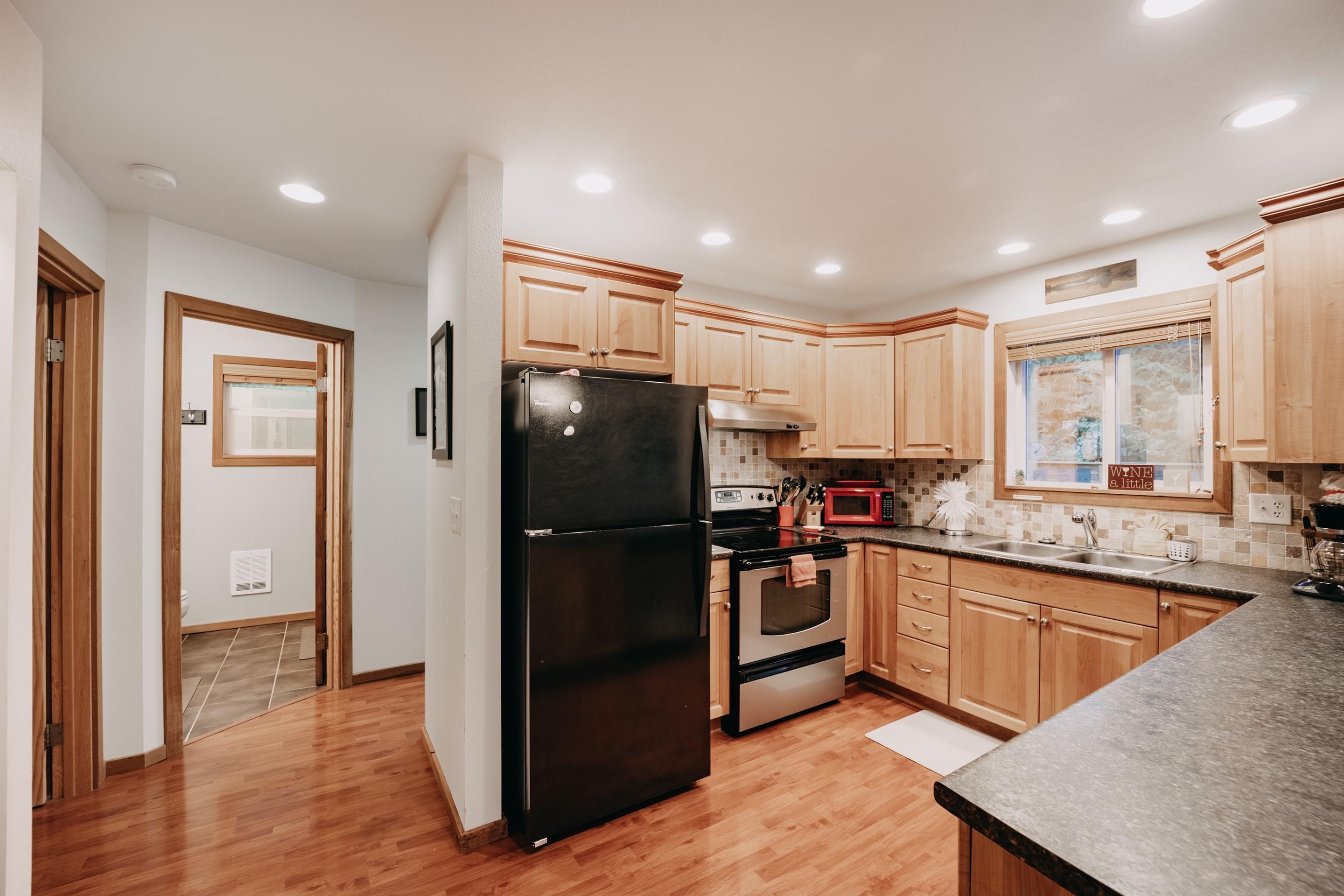 Your family will have a terrific time while staying at The Lasting Memories Chalet! This 2-story, 3+ bedroom, 1 3/4-bath cabin has everything that you need, including air-conditioning. Entering through the side entrance into the mudroom, you’ll discover a stack washer and dryer and plenty of gear storage space. Proceeding a bit further, you’ll be very pleased with the well laid out full bath. Adjacent to that, there is one bedroom with 1-full sized bed, a dresser, and a padded bench. Just beyond the bedroom is a fully equipped kitchen with modern appliances, including a dishwasher, a