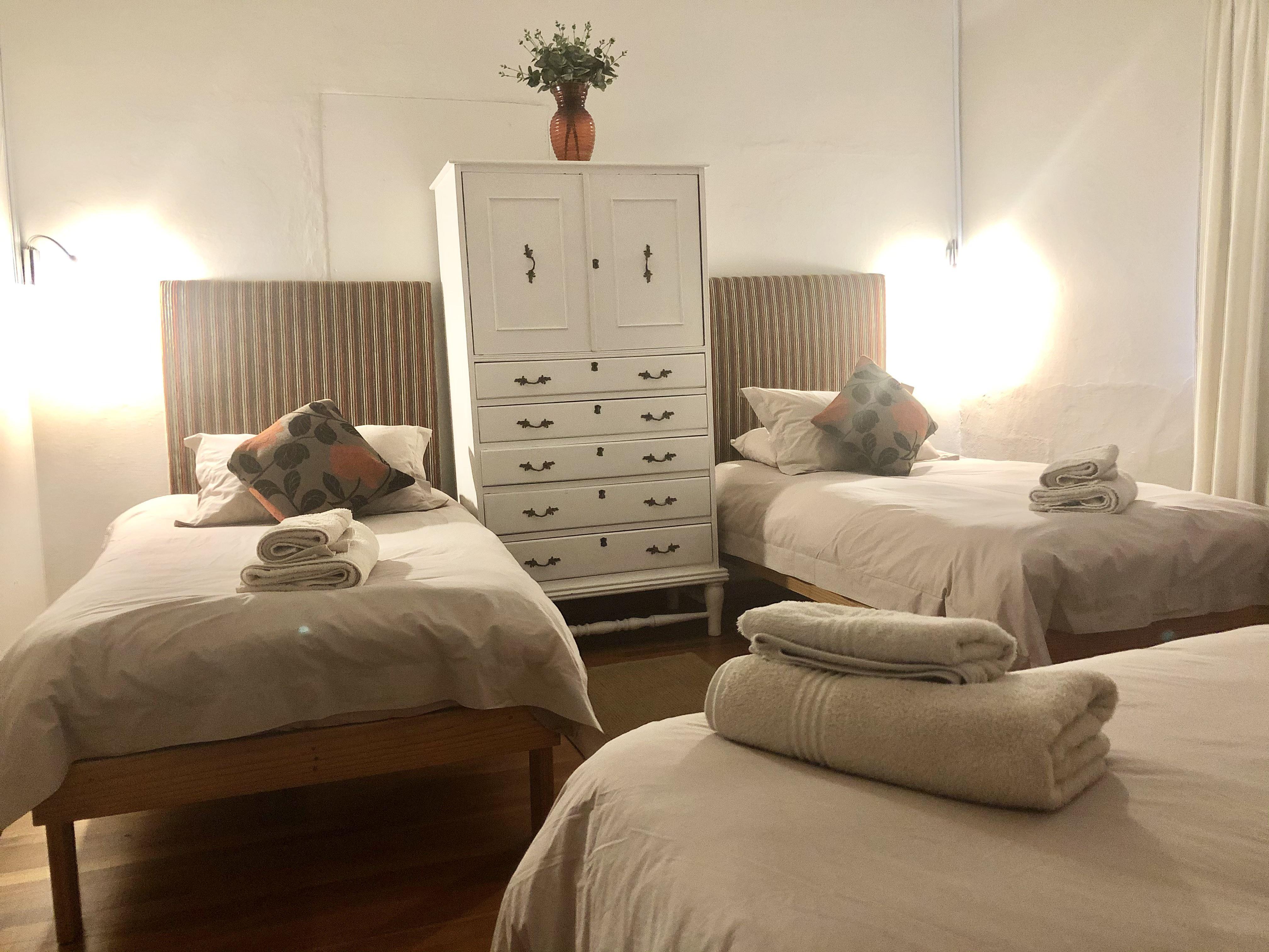 Imagine yourself laying next to a swimming pool in summer enjoying our African sun. This can be a realityat our well-equipped Goedemoed Farmhouse Accommodation where guests can unwind.The house comprises four bedrooms, sleeping 14 guests. The Green Room has a queen-size bed and an en-suite bathroom with a shower. The Red Room has a queen-size bed, baby cot and an open-plan bathroom with a bath. The Brown Room has three single beds. The Orange Room has one queen-size bed and two single beds. On the enclosed patio there are a two further single beds