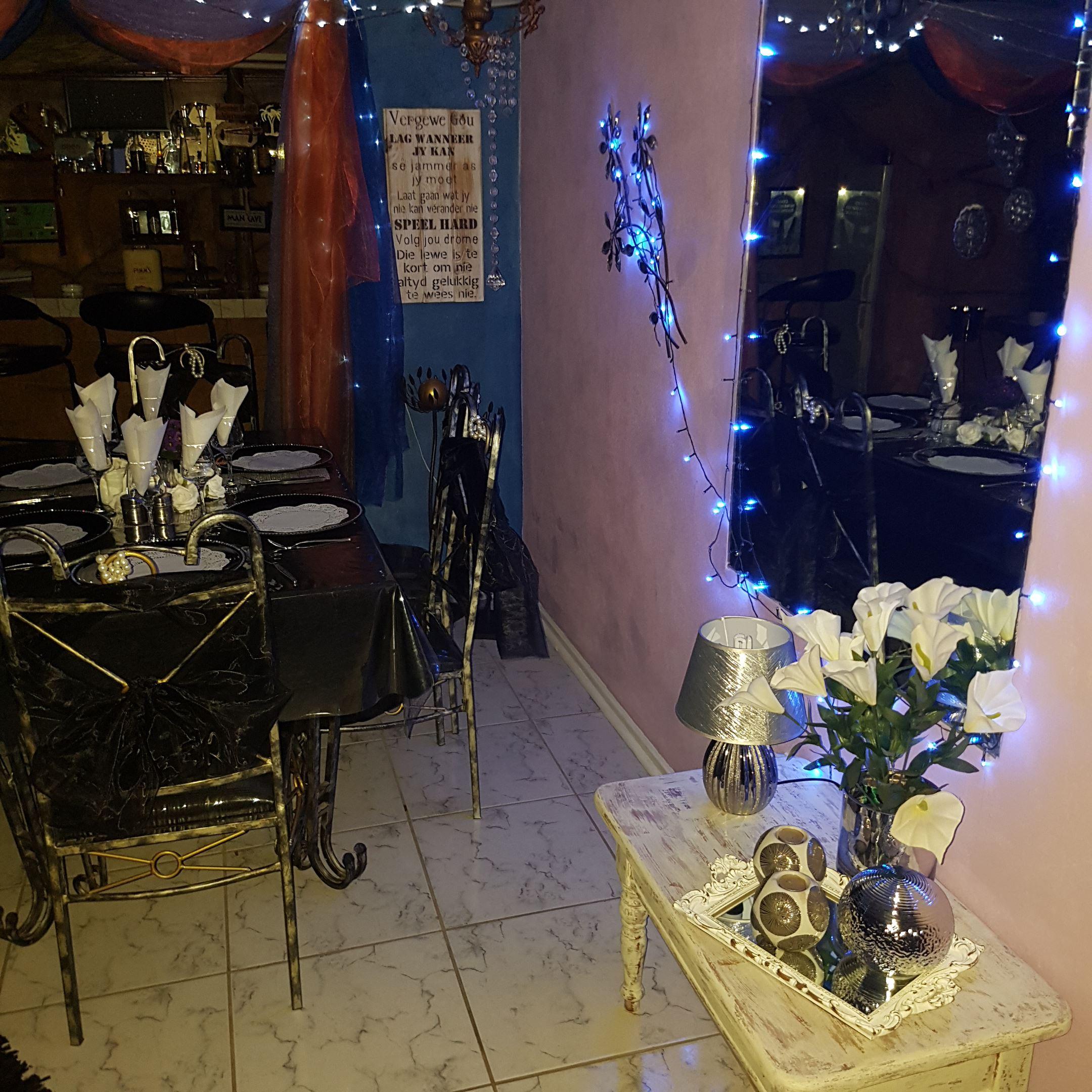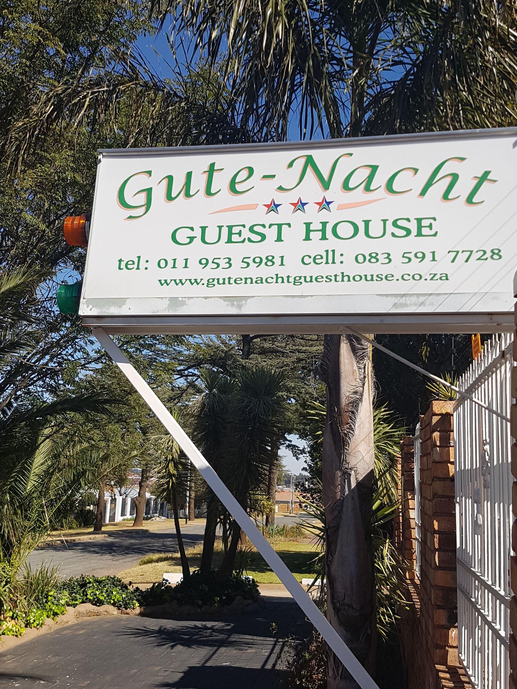 Gute Nacht Guesthouse is situated in the centre of Krugersdorp and is ideal for stopovers and business travellers.The guest house offers five beautiful en-suite rooms equipped with satellite TV and safes for valuables. A fully equipped kitchen is available for self-catering and the guest house has a lounge and dining area where delicious breakfasts and dinners are served. A swimming pool and lapa is available to guests. Braai facilities are also available.Secure covered parking is available and laundry is done for free twice a week. Airport transfers can also be arr