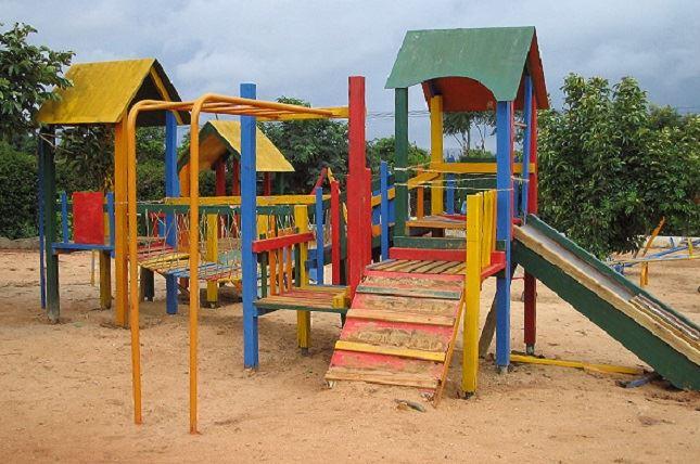There is play area for kids with a jungle gym and a jumping castle.