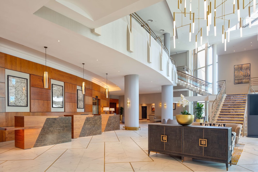 Next to The Waterfront Hall convention center, Hilton Belfast has a fitness room and a modern bar and restaurant. Overlooking the River Lagan, Belfast’s vibrant city center is under a mile away. This 4-star Hilton’s spacious rooms each feature a flat-screen TV with pay-per-view channels, mini-fridges, a marble bathroom and 24-hour room service. Many rooms enjoy city, river or mountain views. With riverside views and floor-to-ceiling windows, Sonoma Bar and Grill offers a menu with Irish produce including Irish lamb. Guests can visit the No.4 bar, specializing in premium drinks including local draft beers and award-winning gins and spirits. The bar serves food from 12:00 daily. Guests attending events at the Belfast Waterfront convention center can walk between there and the hotel without leaving the building. The Odyssey Arena is just a 15-minute walk from the Belfast Hilton. Belfast Cathedral and a range of city-center shops are a 5-minute taxi ride away. Exec Lounge. Restaurant with design inspired by Titanic and Giants Causeway. Prime City Center location next to St Georges Market, minutes walk to Victoria Square and Belfast City Hall.