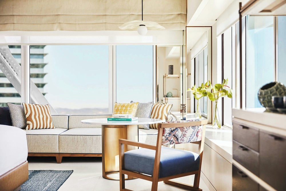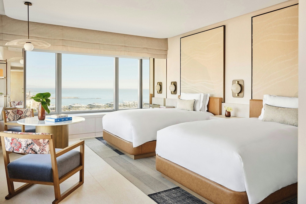 The Hotel Arts Barcelona offers just about everything our guests could want including Mediterranean and city views an outdoor pool a luxury spa and a contemporary art collection. This landmark beachfront hotel towers 44 stories over the Barceloneta boardwalk and has 483 elegantly appointed rooms suites and apartments. Neutral room colors are complemented by rich dark woods luxury bedding and panoramic city and Mediterranean views. Flat-panel cable TVs hairdryers and luxurious bathrooms are all standard. Wi-Fi is available. Enjoy a breakfast on the sun-filled terrace or dine indoors. Choose from among six on-site restaurants serving casual and formal cuisine. Unwind with a relaxing massage or treatment at the on-site spa while you take in breathtaking views 42 stories below. Relax in the outdoor pool and hot tub or with a poolside cocktail on the terrace. Work out in the hotel fitness center or stop in the beauty salon. The hotel also offers meeting space. The hotel overlooks the Mediterranean
