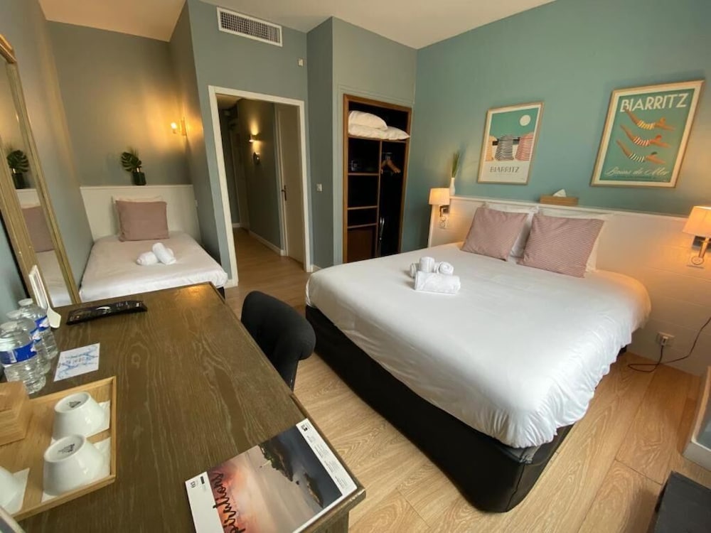 With a dream location in the heart of Biarritz the hotel is 3 minutes away from a large beach a truly magical place shared between swimmers and surfers.Located on the place Sainte-Eugénie a quiet semi-pedestrian square above the old harbour. It is but a few steps away from all the beautiful sites on the city. You will be able to stroll around Biarritz and enjoy the city center and the seaside. Many rooms have past atmosphere and others rooms have been renovated. All have a character and benefitiate of the exceptional location .