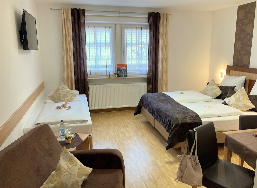 This 3star hotel offers good value for money and a friendly ambience, the rooms are recently renovated and are both modern and cheerful in design. This hotel is located immediately outside the city walls, in front of the 'Wuerzburger Tor' (city gate).The restaurant reflects the medieval history of the hotel, with its beautiful wood paneling and carvings, murals and solid wooden furniture. Rebuilt after its partial destruction in 1945, the hotel has managed to maintain its historically famous 'inn' style. It certainly cannot be mistaken with its bright yellow exterior and red and white striped shutters. The lobby is very small, with a hatch in the wall instead of a desk. It is very atmospheric, and in a typical traditional Rothenburg style.