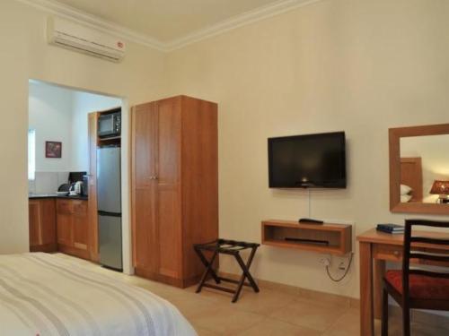Accommodation comprises 15 spacious rooms, each equipped with air-conditioning, a TV with DStv, wireless connectivity, and fully serviced daily. Ten out of the 15 rooms are self-catering units fully equipped with a fridge, microwave, pots, crockery and cutlery, kettle, and toaster. Breakfast, lunch and dinner are served in our cosy restaurant with fireplace, and guests also have free access to the bar and open patio area next to the pool.