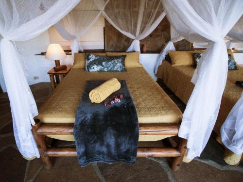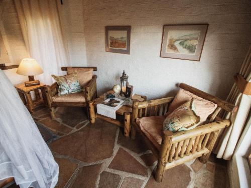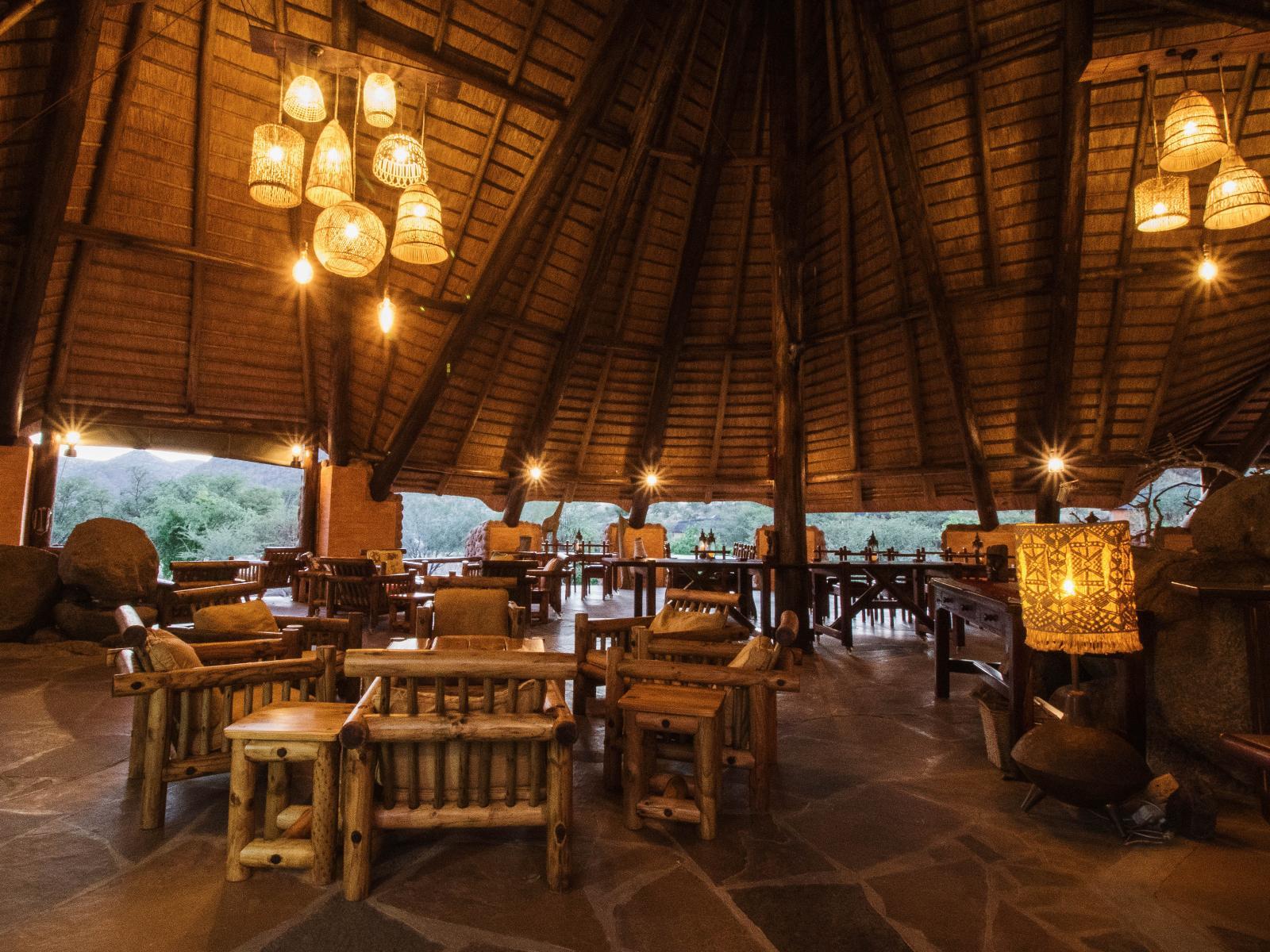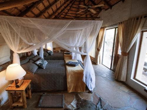 Despite its size, the unique main building blends well into its surroundings, with the irregular thatch roof mirroring the mountain range on the southern banks of the river. Open on all sides, natural rock islands protrude into the main lapa area, and at the rear, the bar offers striking views of the swimming pool, and along the river valley.