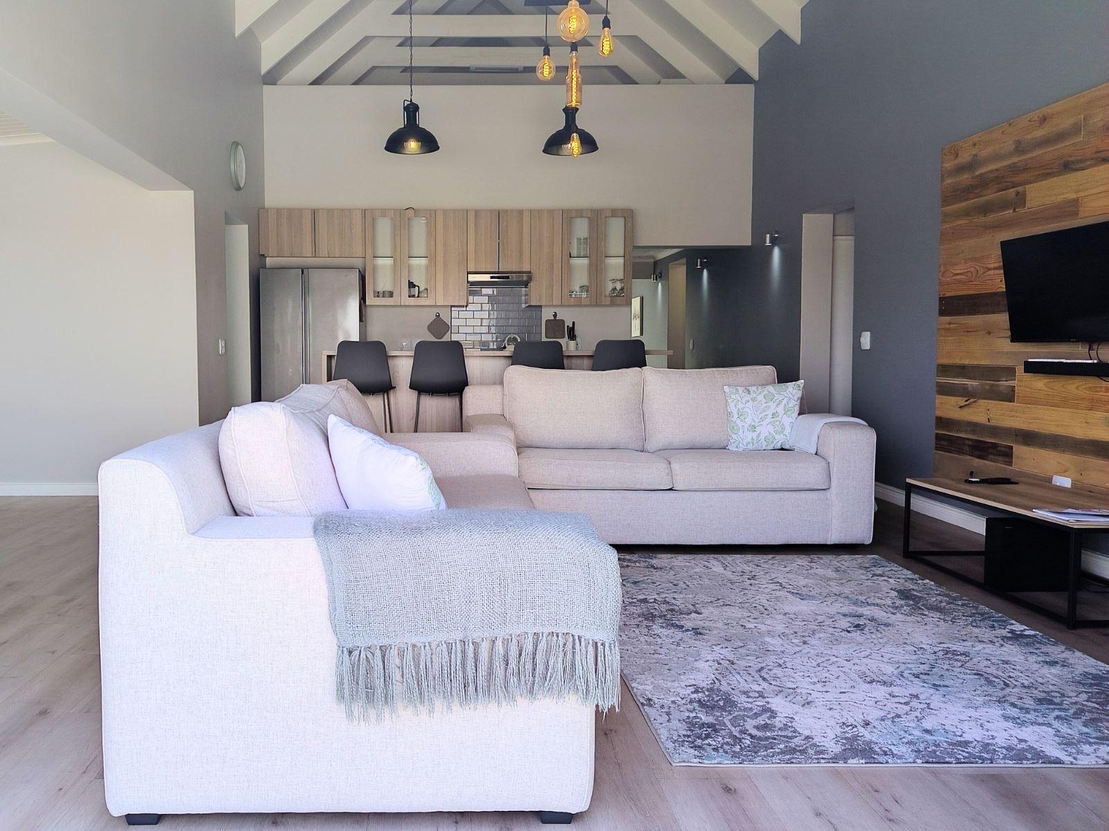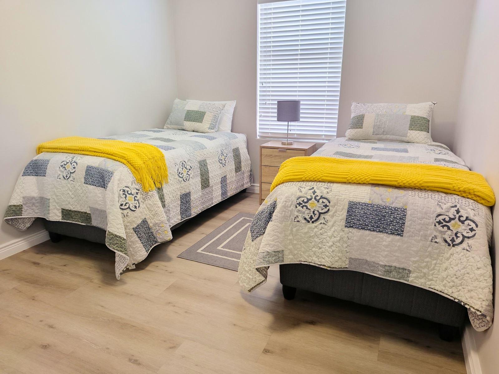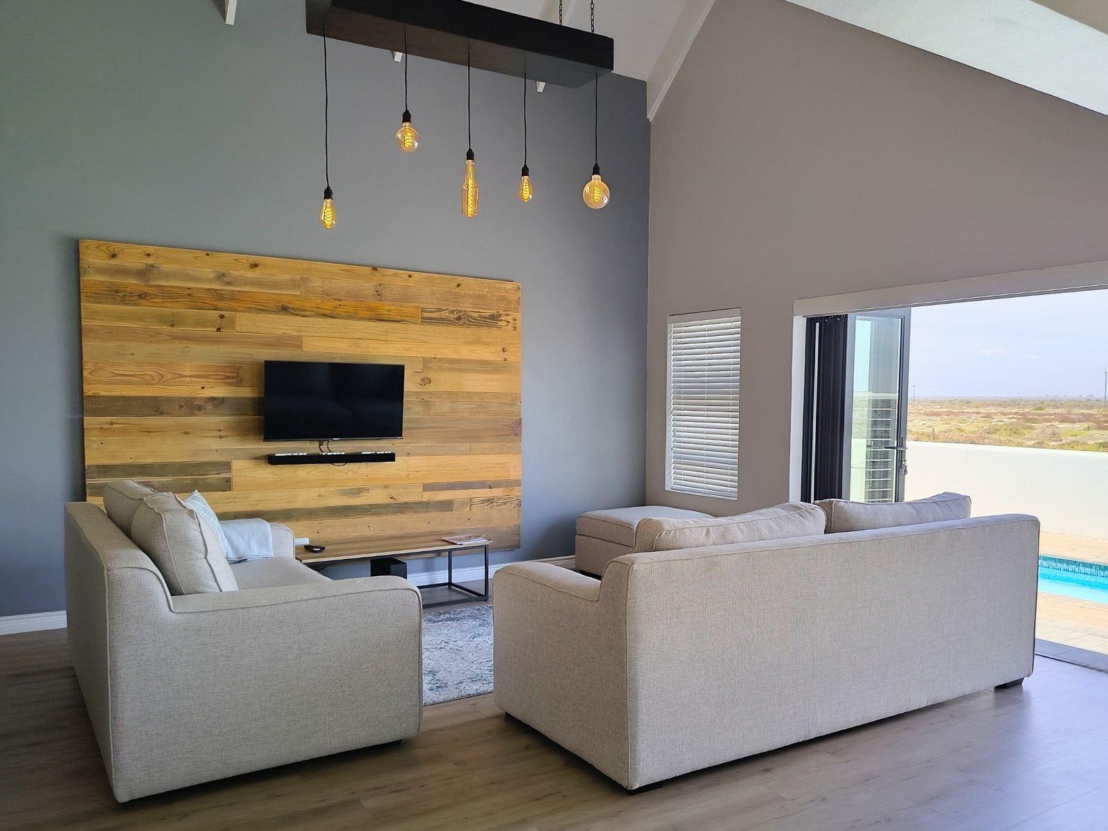 Sandy Feet, is a modern self-catering holiday home located in Dolphin Beach, Dwarskersbos. Designed for families or friends, this stylish coastal retreat offers space, comfort, and relaxed West Coast living.The home features three bedrooms and two bathrooms, comfortably accommodating up to six guests.The main bedroom is furnished with a double bed and includes an en-suite bathroom with a modern shower. The second bedroom also offers a double bed, while the third bedroom has two single beds—ideal for children. The two guest bedrooms share a full family bathroom fitted with bo