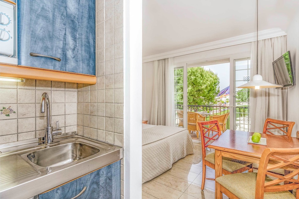 This apartment hotel is located in the centre of Cala d'Or, 200 m from the nearest restaurants, shops, bars and nightspots. It lies 300 m away from Cala d'Or marina and links to the public transport network. Just 500 m away, guests will find the beaches of Cala d'Or and Cala Gran. It is 65 km to Palma and 59 km from Palma de Mallorca Airport.This apartment complex consists of 3 buildings with 3 floors each, housing a total of 162 apartments for 2-4 persons, which are ideal for couples and families. Facilities on offer to guests at this air-conditioned establishment include a lobby area with a 24-hour reception and check-out service, a currency exchange facility and lift access. There is a TV lounge and the younger guests can let off steam at the children's playground or the kids' club. Guests have a cafe, 3 bars and a restaurant at their disposal, as well as conference facilities and WLAN Internet access in all public areas of the hotel, with internet terminals available for an additional fee. Guests can also take advantage of the laundry service (charges apply) and there is parking available for those arriving by car. It is also possible to hire bicycles on the premises.All apartments consist of 1 double bedroom, a living room with 2 sofa beds and a private bathroom with a double sink, a bathtub and a hairdryer. They are equipped with a direct dial telephone, satellite TV, a safe and free ADSL Internet access. They have a kitchenette with 2 electric rings, a fridge, a toaster and an electric kettle, as well as a large balcony with a table and chairs. They are fully air-conditioned and soundproofed, while individually regulated air conditioning and heating are provided in all accommodation as standard.