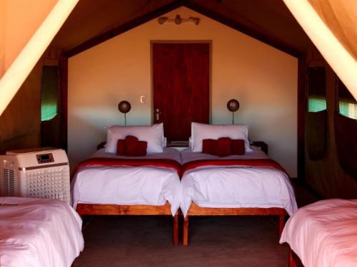 Located near to the Kalahari Anib Lodge in Mariental, Gondwana Collection Kalahari Anib Camping2Go is home to four permanent tents, ideal for travelers who want the luxury of camping, without all the hassle. Each tent is equipped with four beds, an en-suite bathroom, and a shower. Guests can make use of the campsites kitchen which is equipped with a fridge, stove, sink, and necessary utensils. Campers can make use of all facilities of the lodge, including enjoying tasty meals at the restaurant, taking a dip in the pool, or partaking in the lodge's activities.