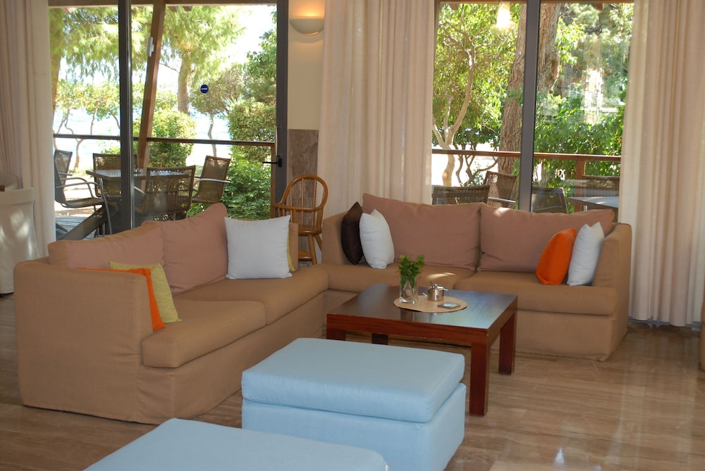 The hotel is ideally situated, overlooking the sea, yet hidden in the tranquillity of a vast, well-tended garden. It sits midway on a horseshoe-shaped bay with pristine, undeveloped beaches stretching 19 km in each direction. The beach is only 10 meters from the hotel and the town centre of Karystion is mere 400 meters away. There is a Venetian tower at the western edge of the hotel park. From their private balcony guests can enjoy the views of the bay of Karystos or the beautiful hotel garden grounds. A hearty breakfast made with local fresh products is served every morning. Guests will enjoy dishes from the Mediterranean cuisine and the hotel's special home-made puddings.