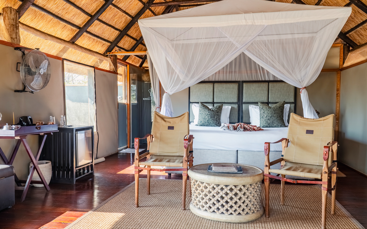 Khulu Bush Camp is set in the secluded area of Hwange, surrounded by natural vegetation and a variety of bird- and wildlife.There are six beautifully decorated suites, each with balconies overlooking the private waterhole. The exclusive Honeymoon Suite has an outside bathtub, providing the perfect spot to appreciate the river view. Meals can be enjoyed in the spacious dining area, or just relax in the rustic lounge.Cool off in the plunge pool, or take some time to gaze at the stars while sitting around the firepit. There is a fully equipped bar with a variety of loca