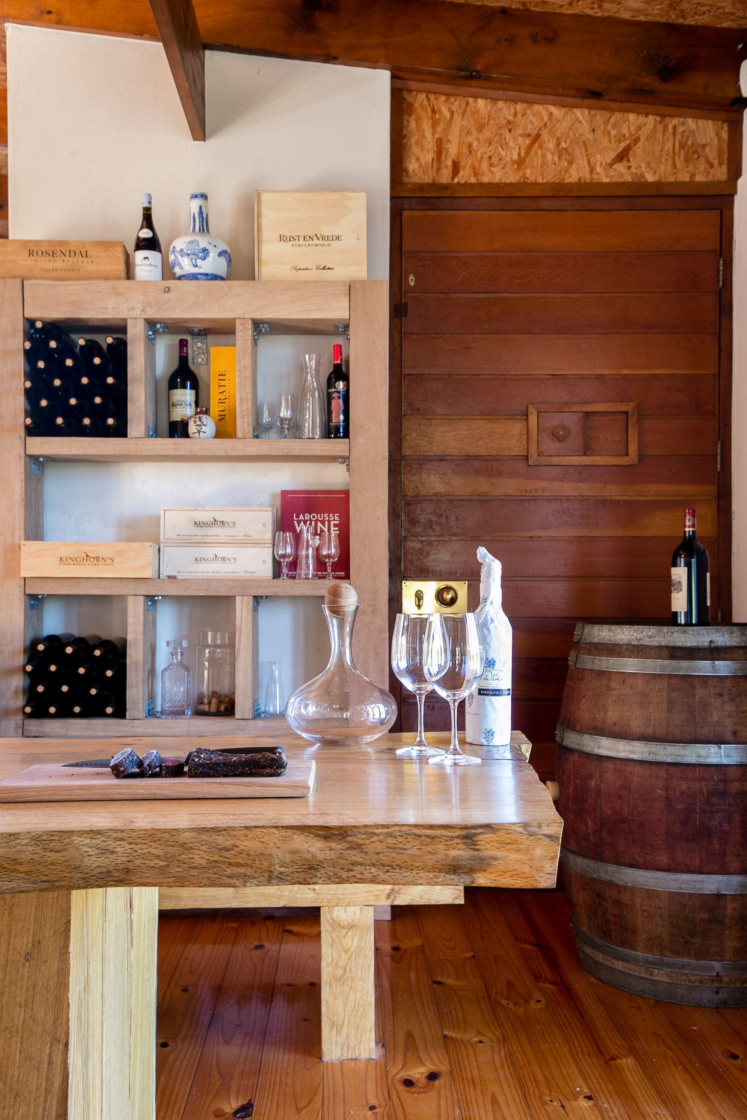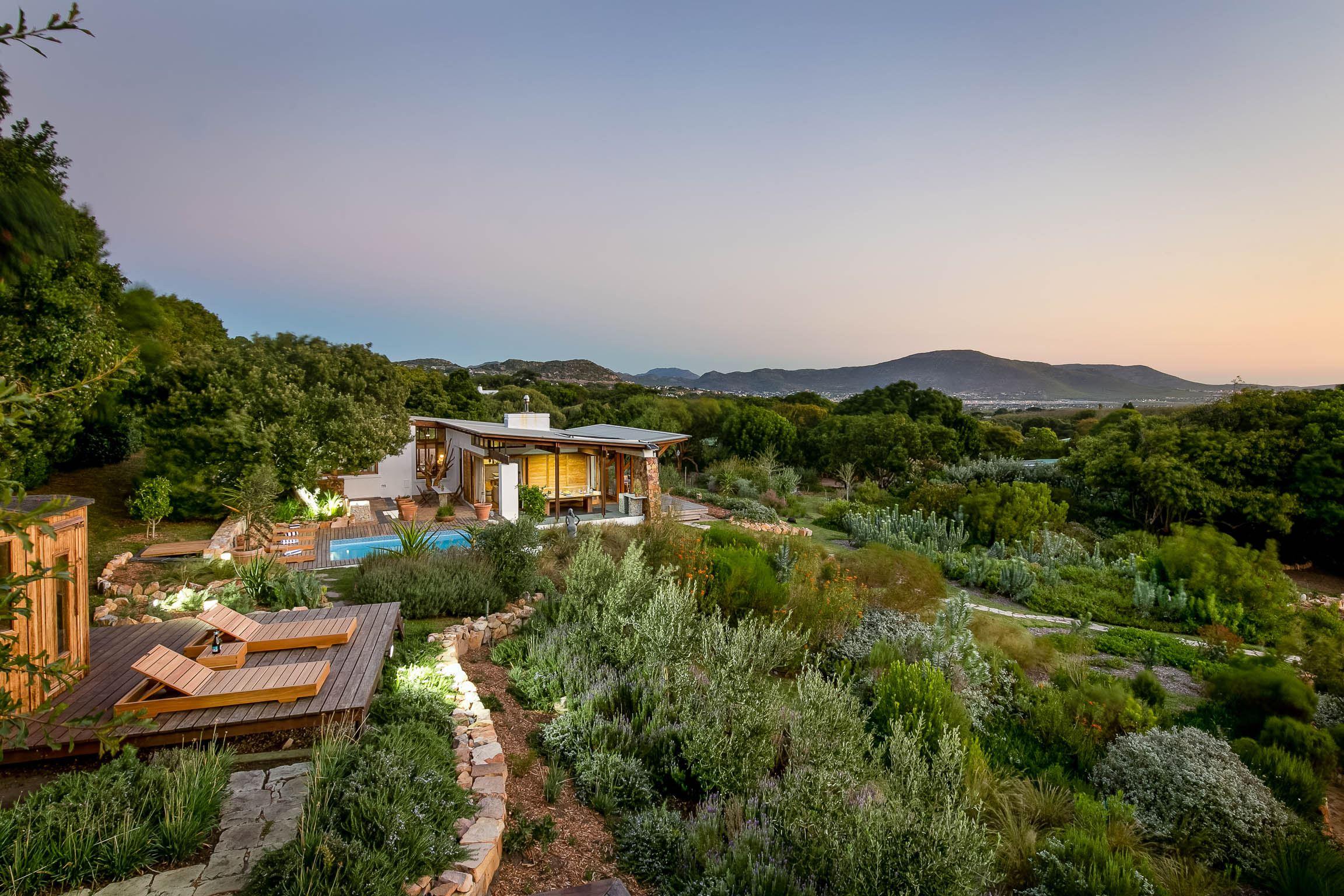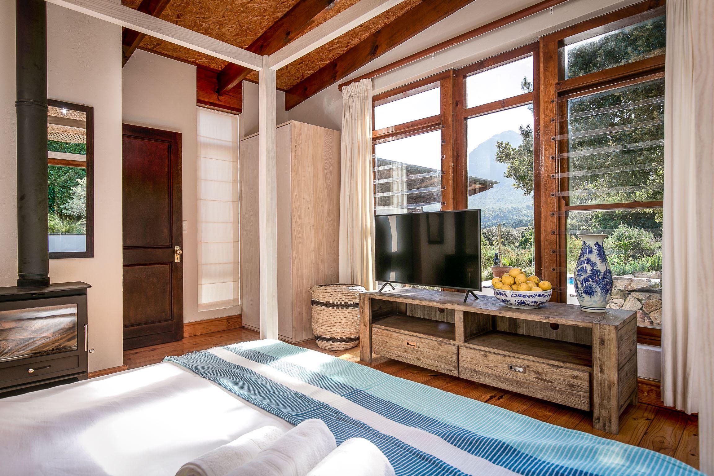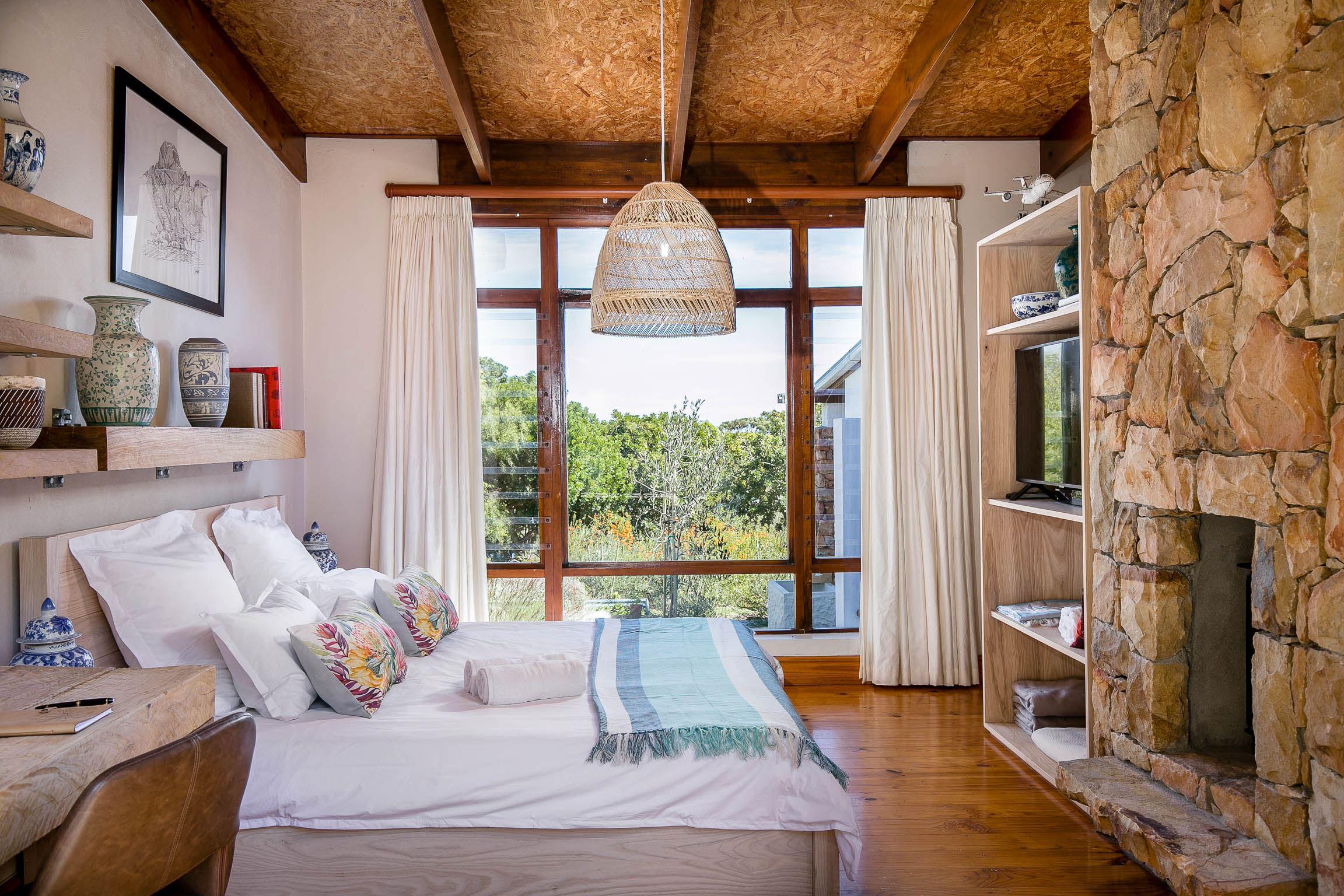 The villa is composed mainly of natural stone and high quality hardwoods and has a sociable entertainment flow.The kitchen is well equipped for easy catering with a full gas oven and gas stove and leading into an open plan dining room equipped with a ten-seater oak dining table located in between the fireplace and the wine bar. Glass sliding doors in the living room offer panoramic views of the large garden.A large central fireplace creates a cosy ambience during our winter months. There are two bedrooms, each with a king extra size double bed and both with en-suit